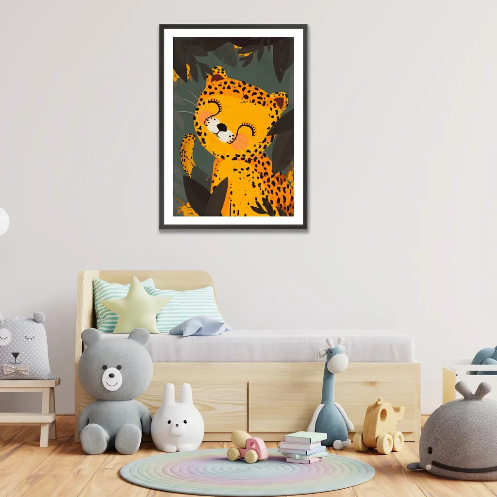 Framed kids art print Little Leo by artist Treechild is a fun addition to any nursery & kid's room decor. Whether they're an animal lover or just enjoy bright colors. It features the image of a baby leopard playing among jungle leaves—making it a playful piece. This piece is handcrafted in Chattanooga, Tennessee by Ready2HangArt, using eco-friendly practices. The print is archival with a white border, assembled in a 100% pine wood frame and finished with hardware for simple installation.