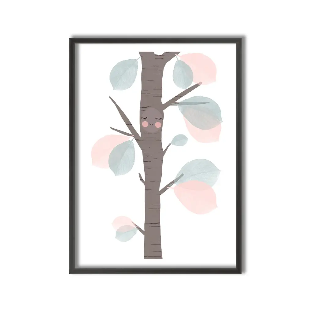 Framed kids art print Little Tree by artist Treechild is a fun addition to any nursery & kid's room decor. It features a small smiling tree with leaves in pastel shades of pink and blue — making it a playful design. This piece is handcrafted in Chattanooga, Tennessee by Ready2HangArt, using eco-friendly practices. The print is archival with a white border, assembled in a 100% pine wood frame and finished with hardware for simple installation.