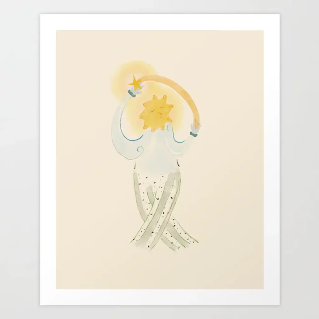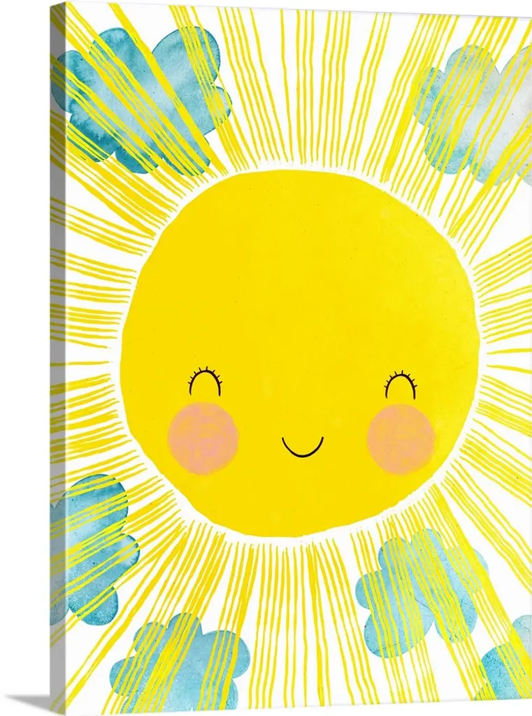 Framed kid's art print Matahari by artist Treechild is a fun addition to any nursery & kid's room decor. It features a shining sun with a smiling face sitting in the center of this piece - making it a playful design. This piece is handcrafted in Chattanooga, Tennessee by Ready2HangArt, using eco-friendly practices. The print is archival with a white border, assembled in a 100% pine wood frame and finished with hardware for simple installation.