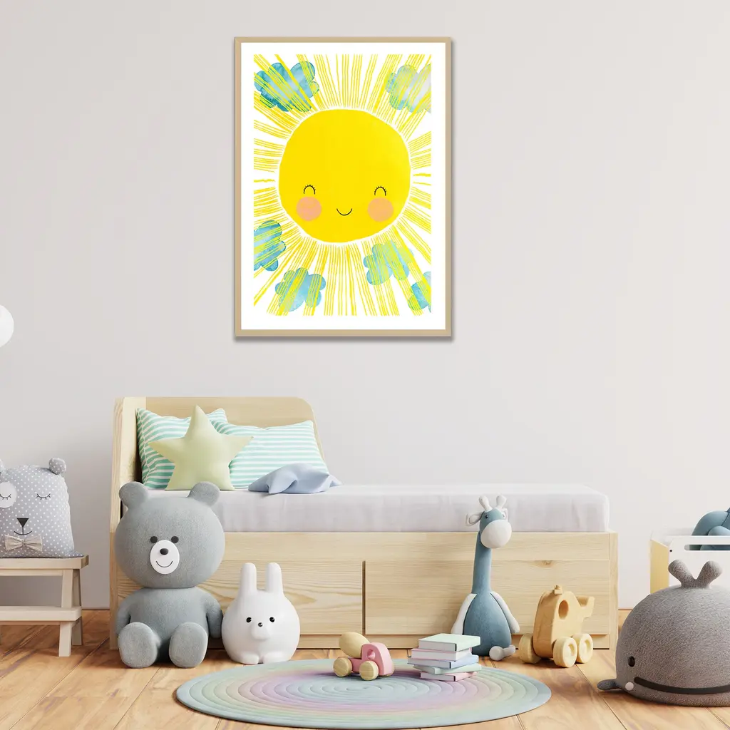 Framed kid's art print Matahari by artist Treechild is a fun addition to any nursery & kid's room decor. It features a shining sun with a smiling face sitting in the center of this piece - making it a playful design. This piece is handcrafted in Chattanooga, Tennessee by Ready2HangArt, using eco-friendly practices. The print is archival with a white border, assembled in a 100% pine wood frame and finished with hardware for simple installation.