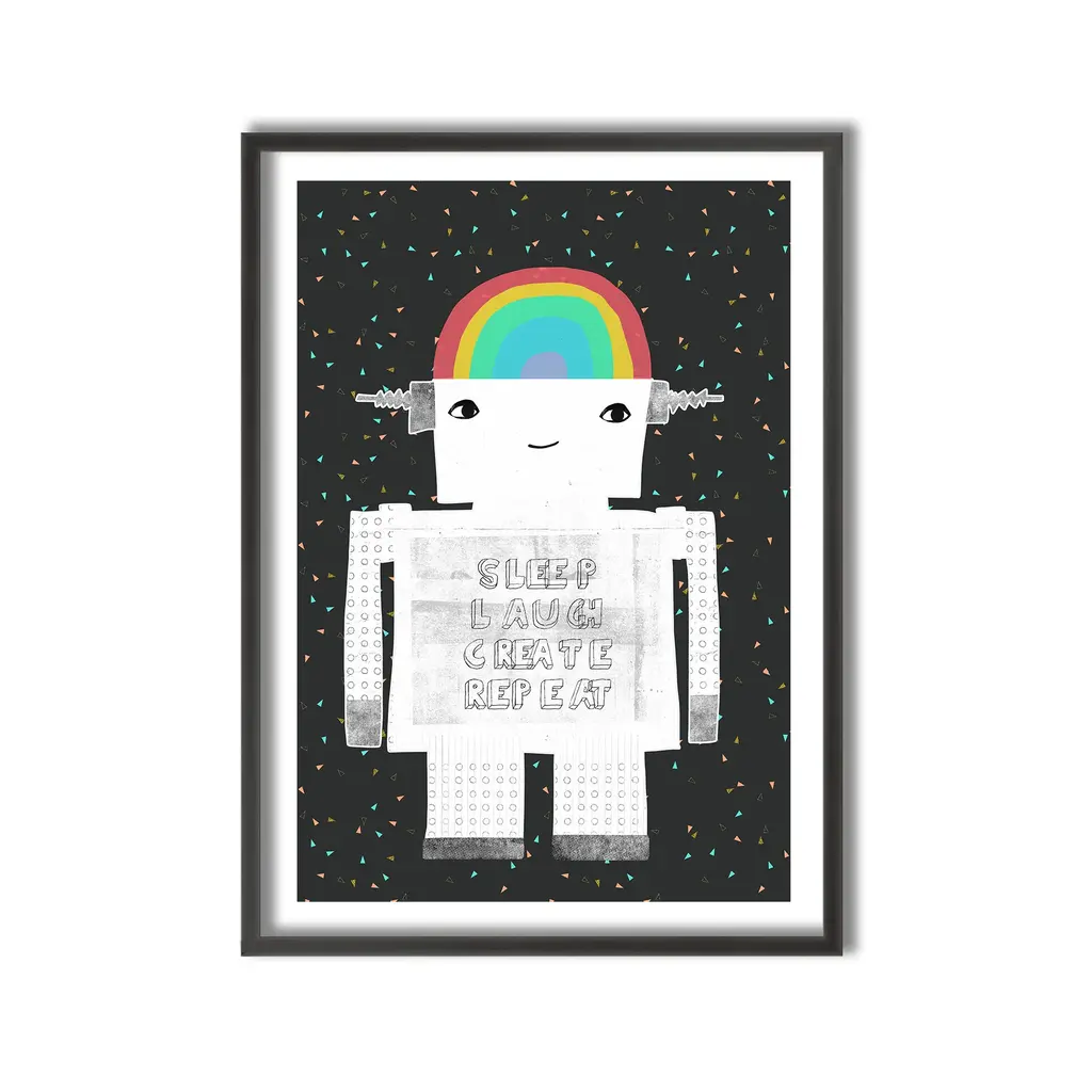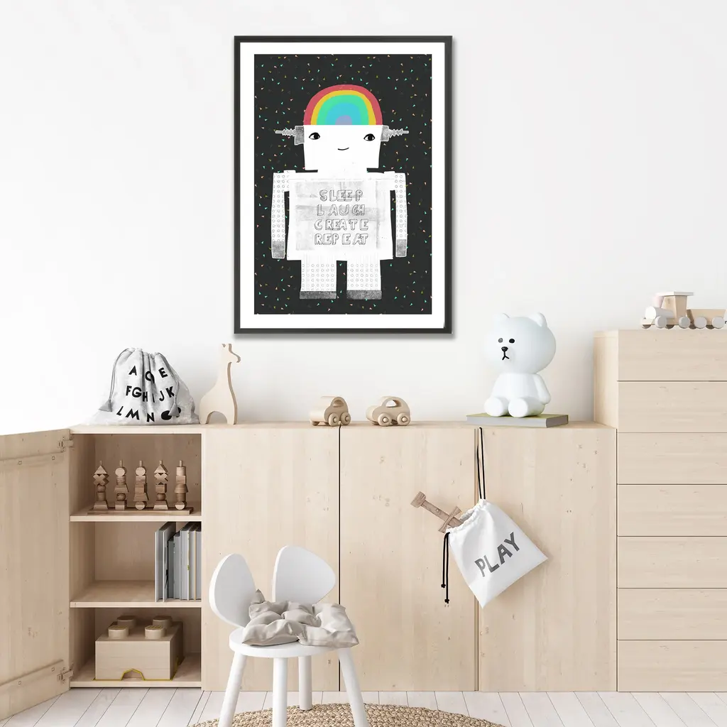 Framed kids art print Sleep Laugh Create Repeat by artist Treechild is a fun addition to any nursery & kid's room decor. It features a colorful confetti background and a happy robot with a rainbow on its head and the words "sleep, laugh, create, repeat" —making it a playful piece. This piece is handcrafted in Chattanooga, Tennessee by Ready2HangArt, using eco-friendly practices. The print is archival with a white border, assembled in a 100% pine wood frame, and finished with hardware for simple installation.
