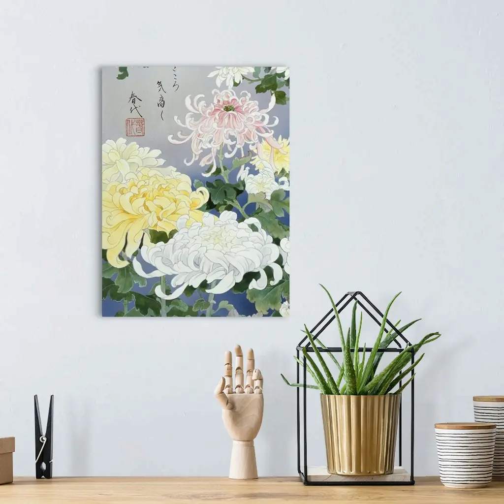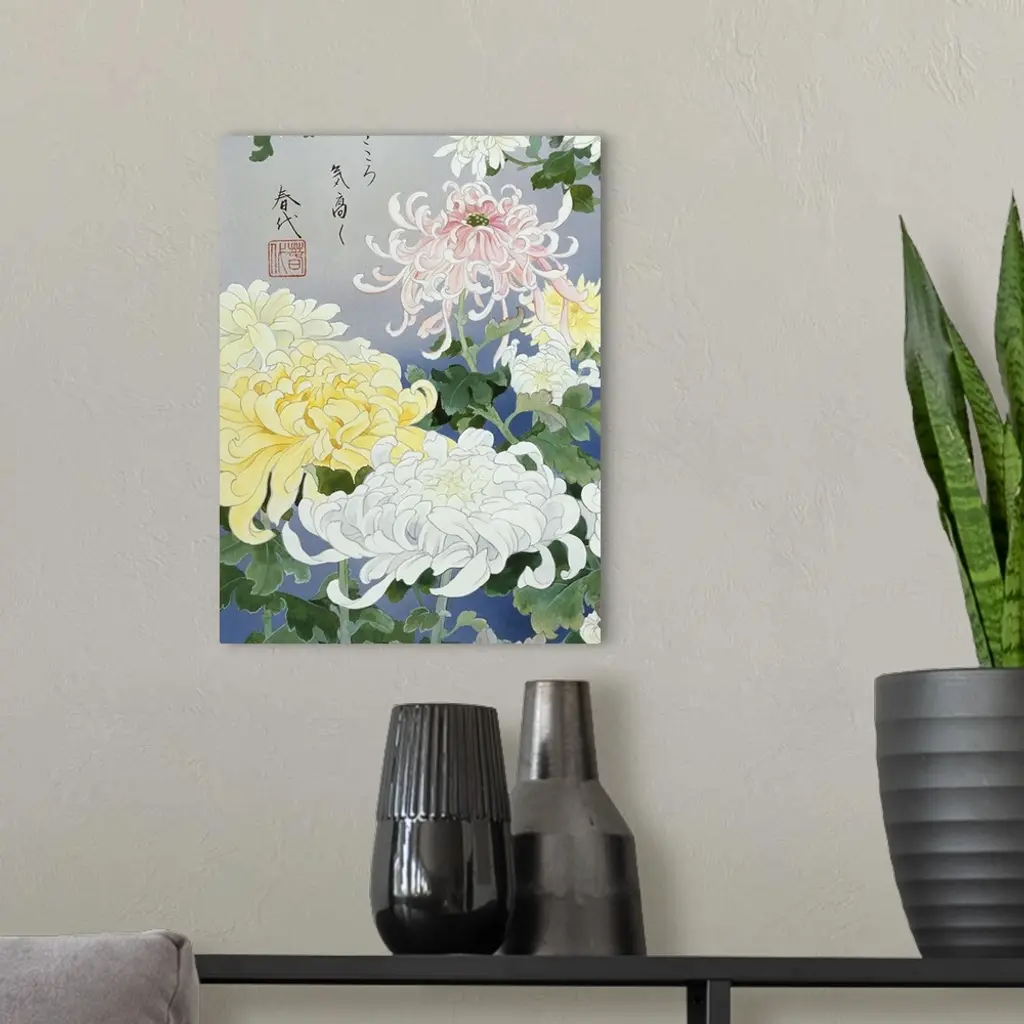 Contemporary colorful and lavish looking Asian artwork. With white and yellow flowers.