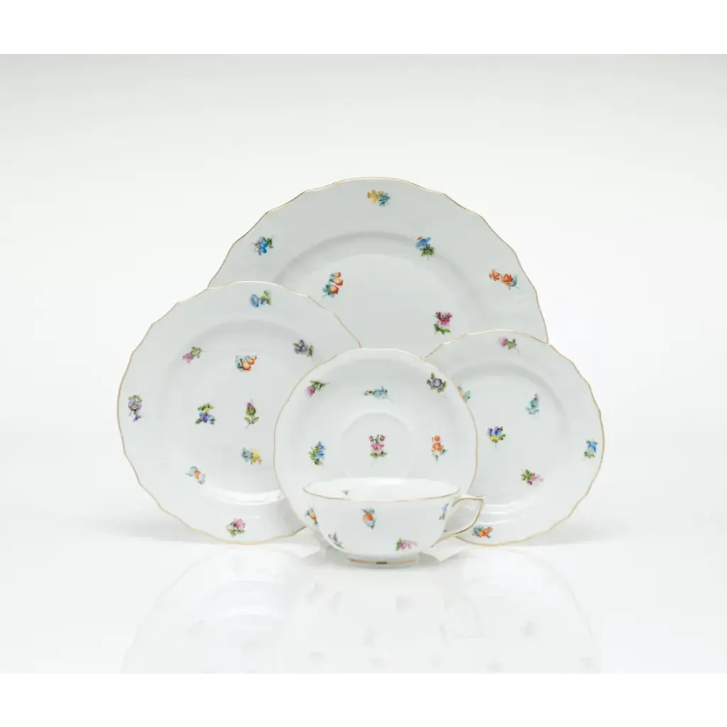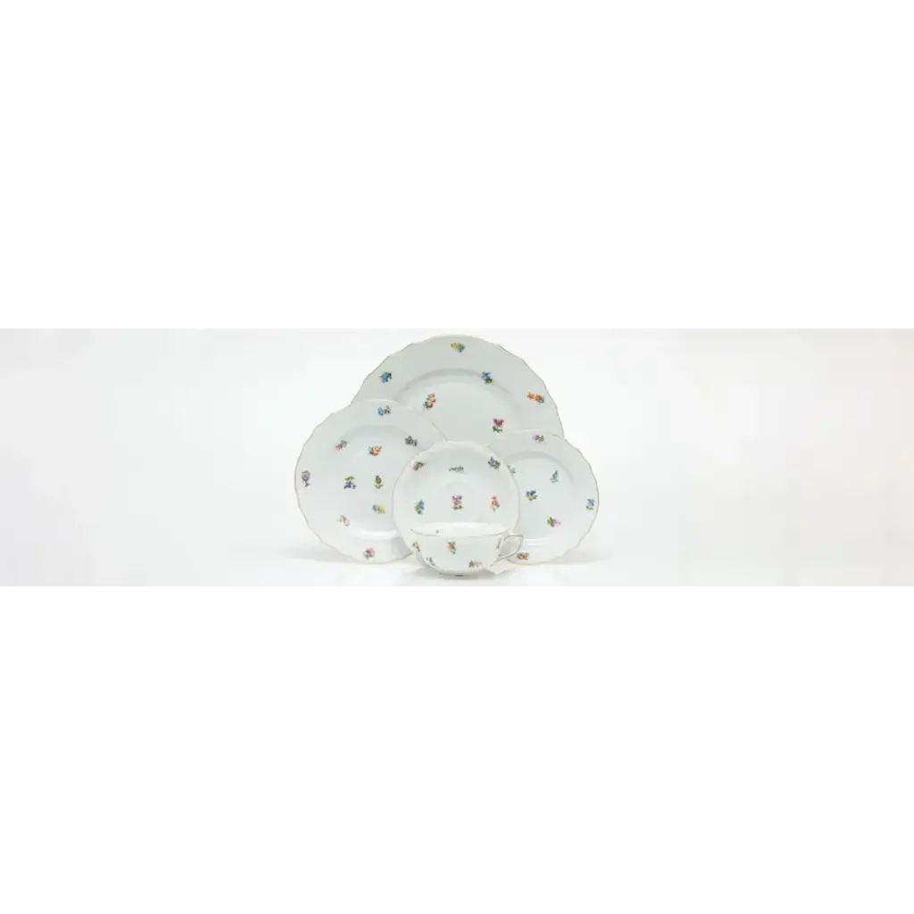 A showcase of remarkable floral paintings in miniature, this "milles fleurs" (thousand flowers) pattern features painstakingly petite blossoms on a pure white field. Hand painted in Hungary. Now the biggest porcelain manufactory in Europe, Herend was founded in 1826 to produce earthenware in the small Hungarian village for which it was named. At the time, Hungary was flooded with low-cost pottery, but in 1839, Mor Fischer became the Manufactory’s new owner and he decided to focus on producing dinnerware replacement pieces for Europe’s royal families to complement their valuable porcelain patterns from Germany and the Far East. As his client base grew, Fischer commissioned his artists to begin designing dinnerware patterns of their own. Queen Victoria’s 1851 purchase of a large set for Windsor Castle was a milestone, setting the stage for aristocrats throughout Europe to clamor for Herend in their estates. In the 1850s, Herend added meticulously-crafted figurines to its creations. Herend’s trademark fishnet pattern, which is widely recognized and prized as Herend’s signature design, started in 1858 when an artist who was intrigued with a Chinese plate’s fish scale design painted it onto a rooster figurine to imitate feathers.