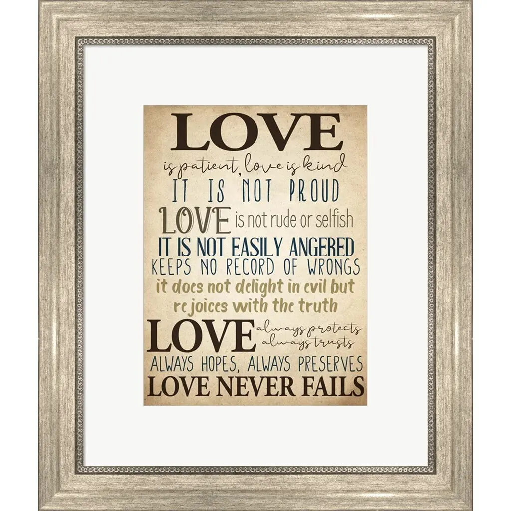 Love Is by Kimberly Allen is a high quality piece of framed artwork. The finished size of this piece is 17" X 20". It has a Classic Champagne Silver with Ornate Inner Edge frame, is single matted and finished with high quality Acrylic Plexiglass. 100% Satisfaction Guaranteed.