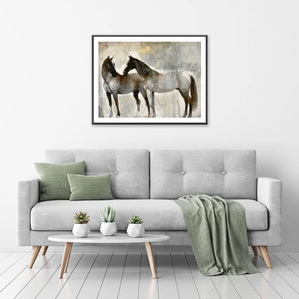 Follow 'Kindred' stallions by Norman Wyatt Jr. who wander modestly through bleak shadows. The horizontal decorative artwork will complement your space with its transitional and contemporary aesthetic. This piece is handcrafted in Chattanooga, Tennessee by Ready2HangArt using a locally sourced artist print, with a frame and a rear hanger for simple installation. Offering a wide range of transitional subjects and unique textures, Norman Wyatt's collections will add interest to any modern or contemporary decor.