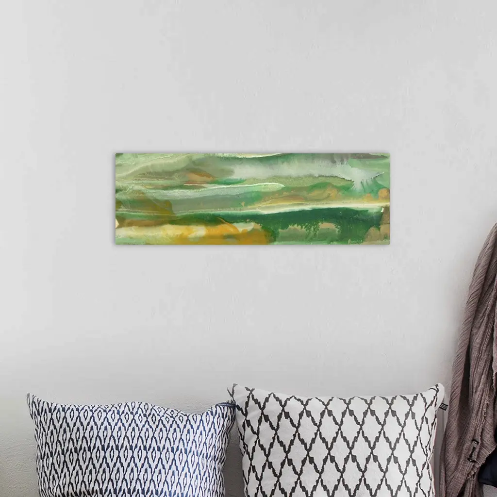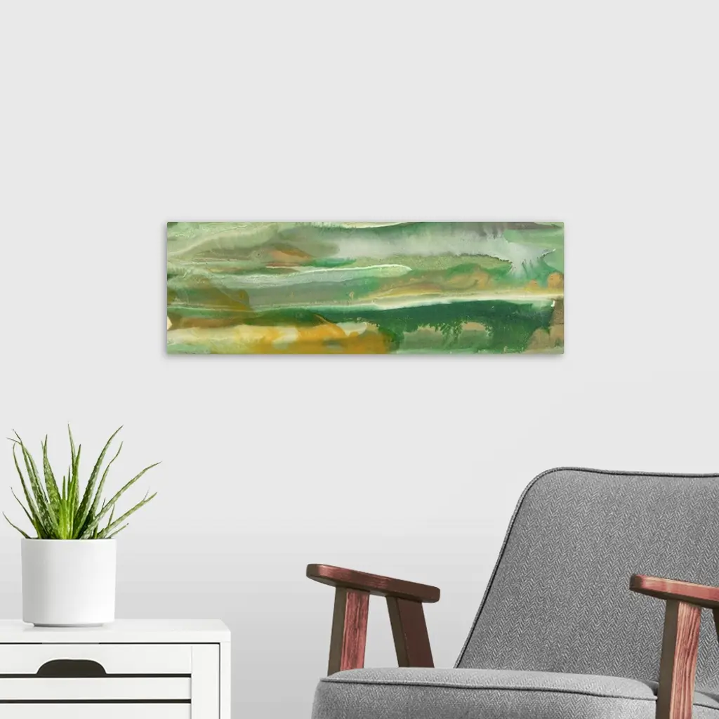 Contemporary abstract painting in layered shades of green.