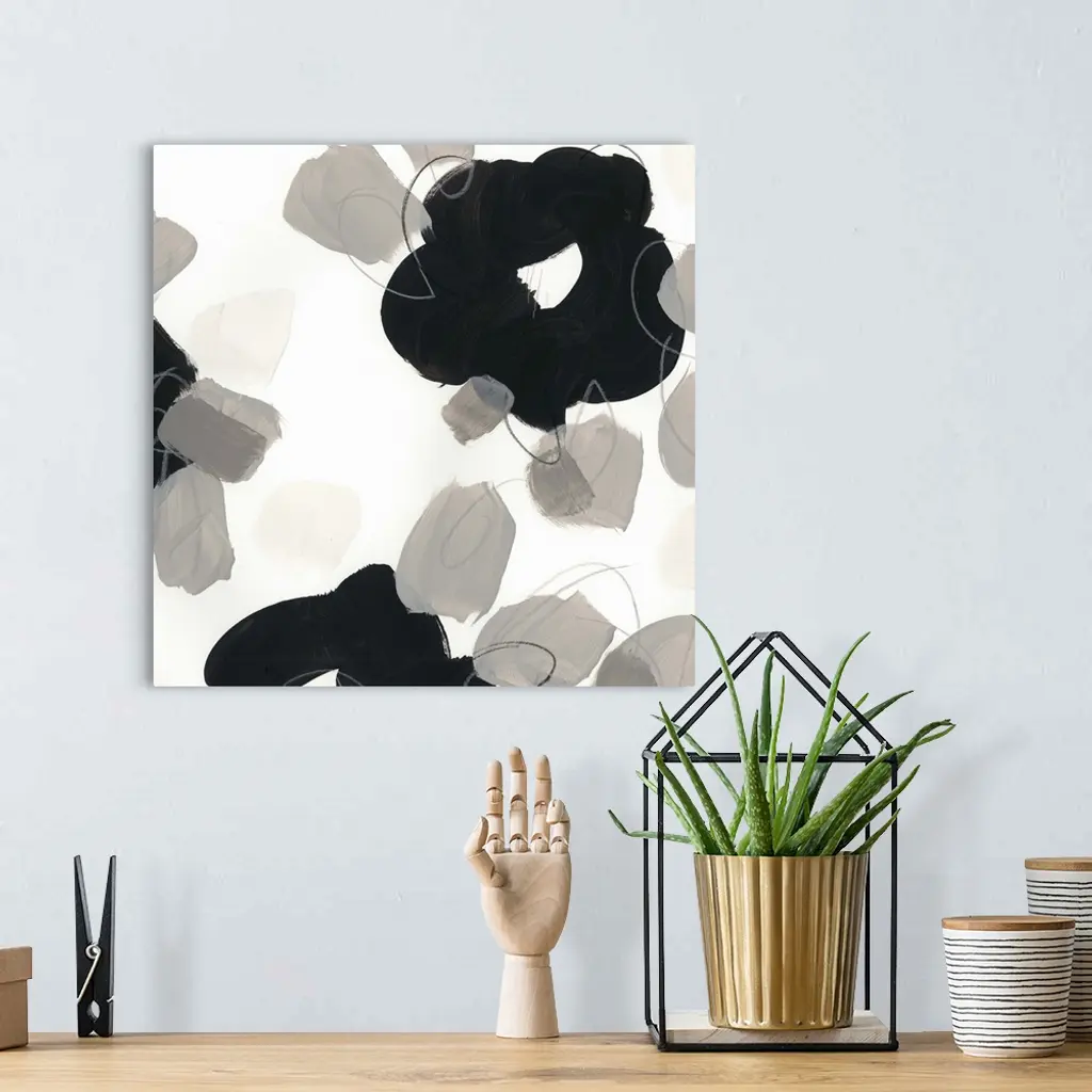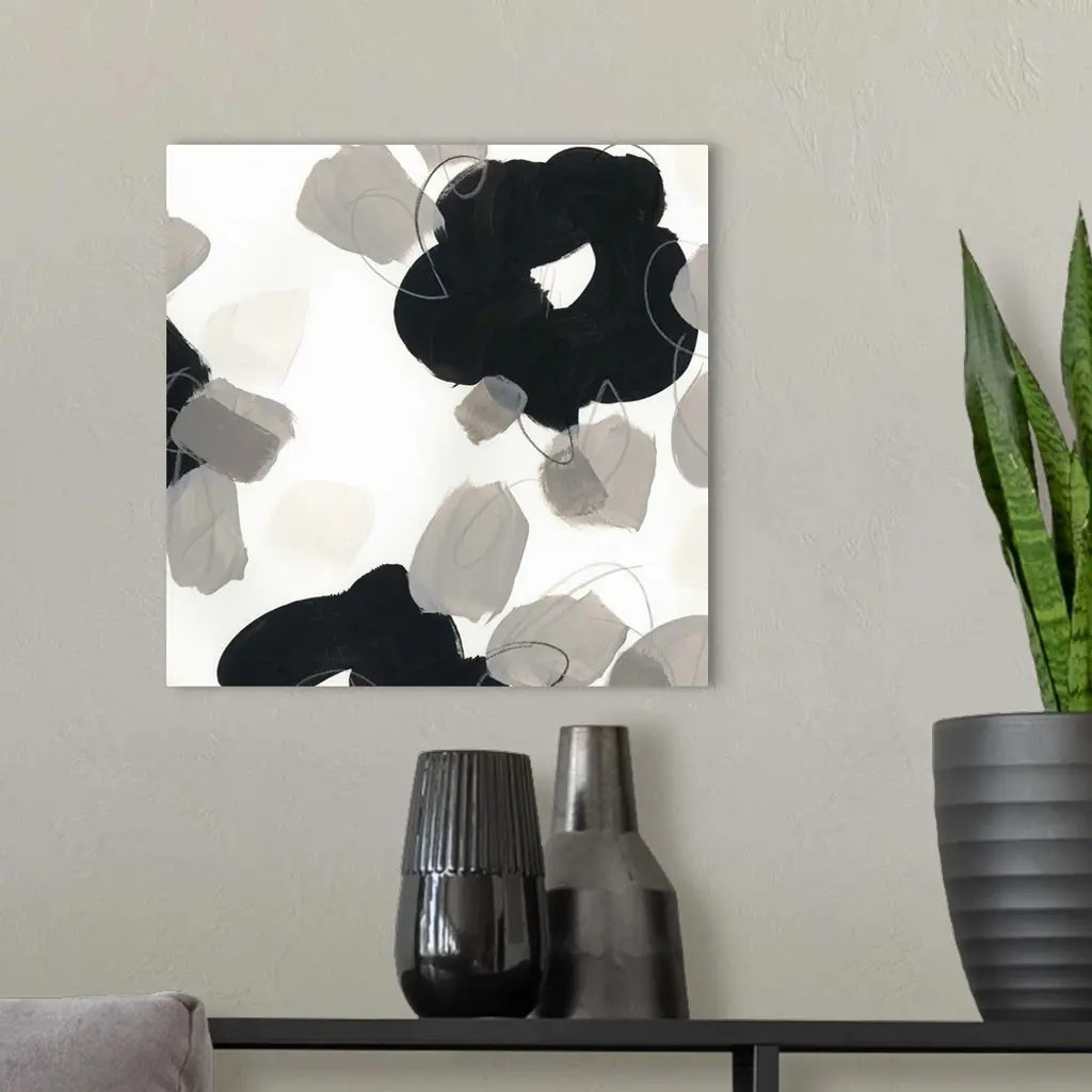 Abstract floral painting with broad black shapes on white and grey.