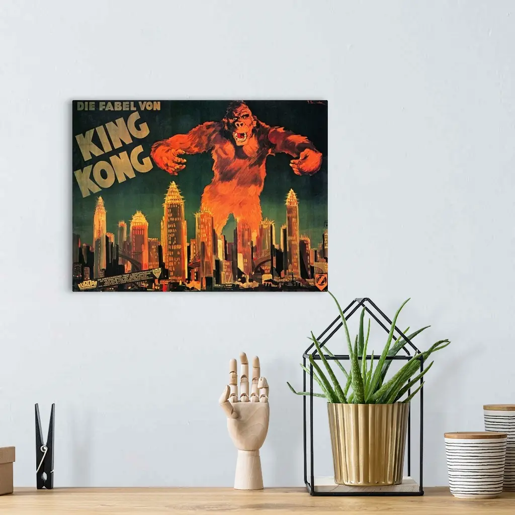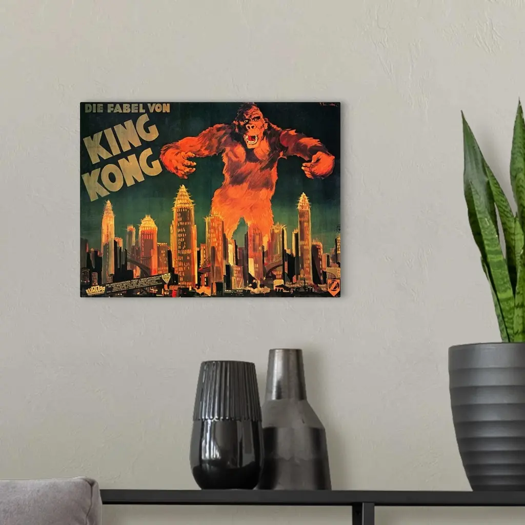 Large landscape vintage artwork of King Kong, as the large ape towers over the skyscrapers in a city, at night.