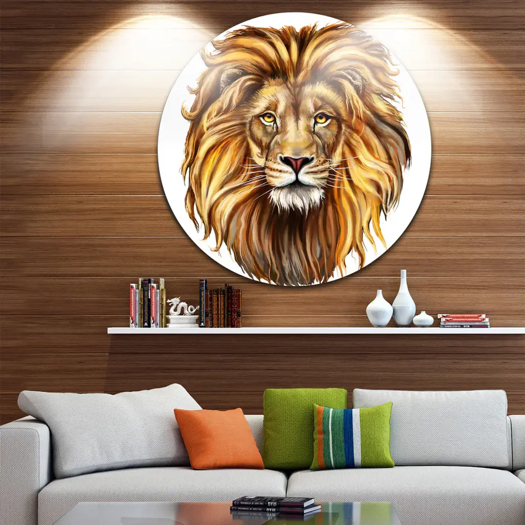 Bring Contemporary Abstraction to your home with this large Circle Metal wall art. This King Lion Aslan Metal Artwork makes it the focal point of any room or office. - White Gloss Coating ensures colors are extra vibrant with light reflection.- Aluminum grade Sheet Metal with 1 inch mounting frame on the back giving the illusion that the artwork is floating on the wall..- Mounting Brackets are included along with instructions.- High Quality Digital images are created directly into a glossy aluminum panel producing a stunning and captivating print into the glossy finish of the metal.- Water, Fire and Scratch resistant HD Aluminum panels.- Looks better than any photo paper and guaranteed to last at least 20 years- Easy to clean with a microfiber cloth. Colors are far superior to regular Canvas Art. - Easy to Hang