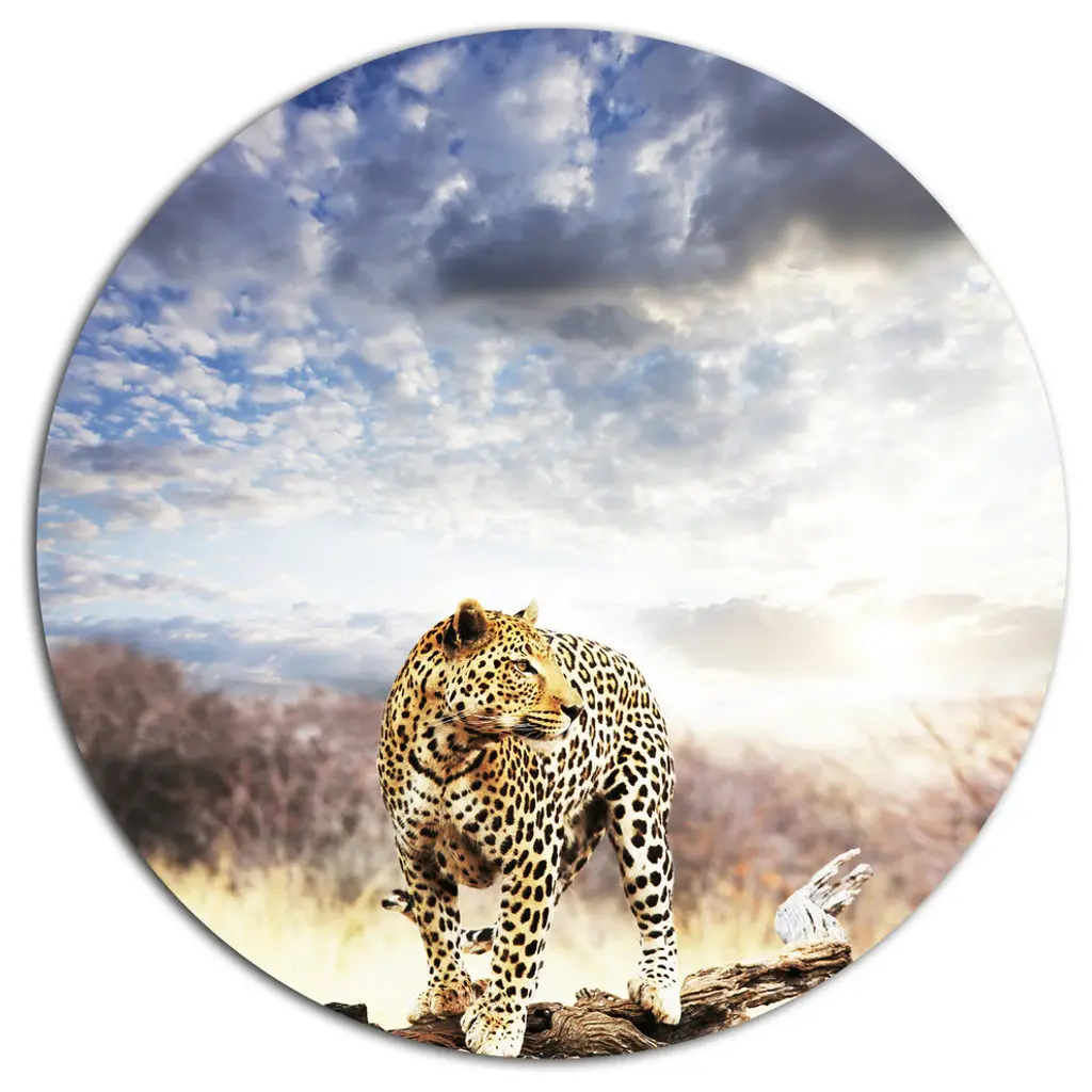 Bring Contemporary Abstraction to your home with this large Circle Metal wall art. This King of Animals At Sunset Metal Artwork makes it the focal point of any room or office. - White Gloss Coating ensures colors are extra vibrant with light reflection.- Aluminum grade Sheet Metal with 1 inch mounting frame on the back giving the illusion that the artwork is floating on the wall..- Mounting Brackets are included along with instructions.- High Quality Digital images are created directly into a glossy aluminum panel producing a stunning and captivating print into the glossy finish of the metal.- Water, Fire and Scratch resistant HD Aluminum panels.- Looks better than any photo paper and guaranteed to last at least 20 years- Easy to clean with a microfiber cloth. Colors are far superior to regular Canvas Art. - Easy to Hang