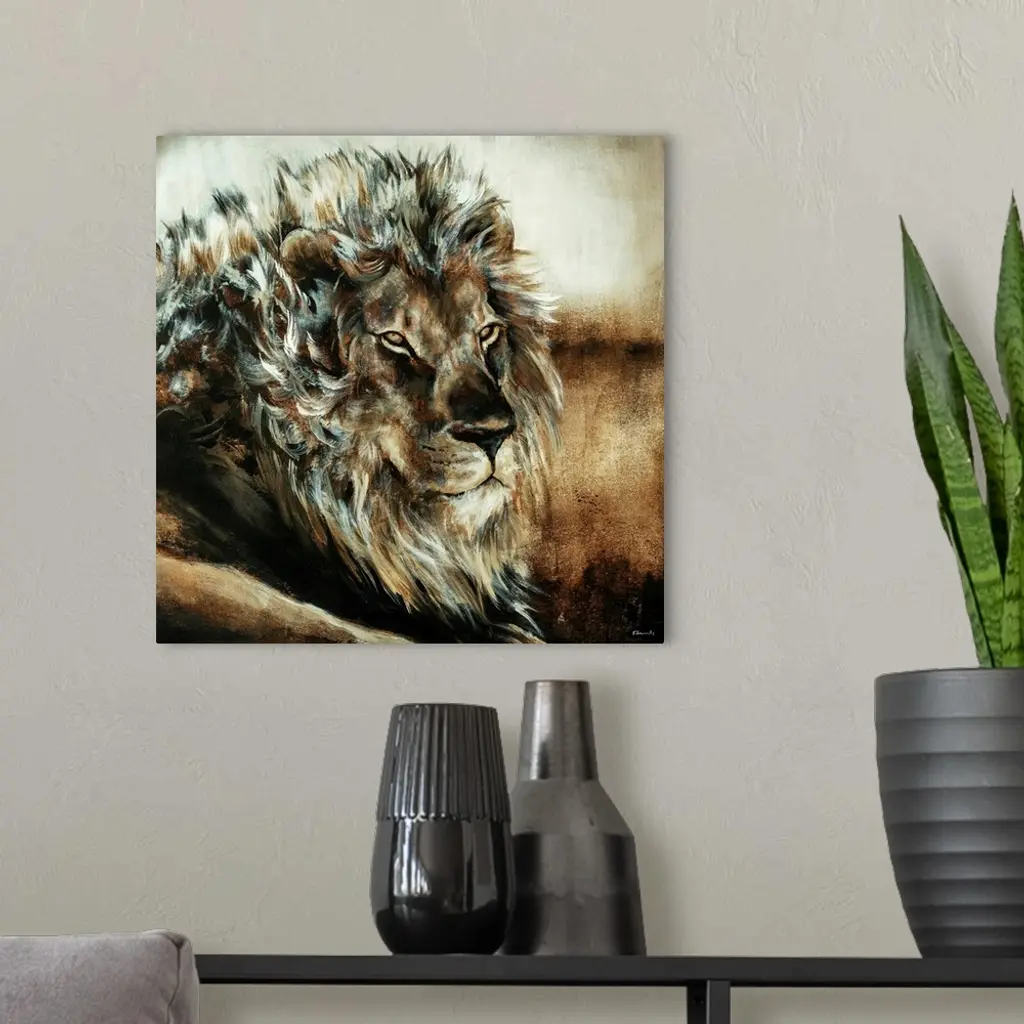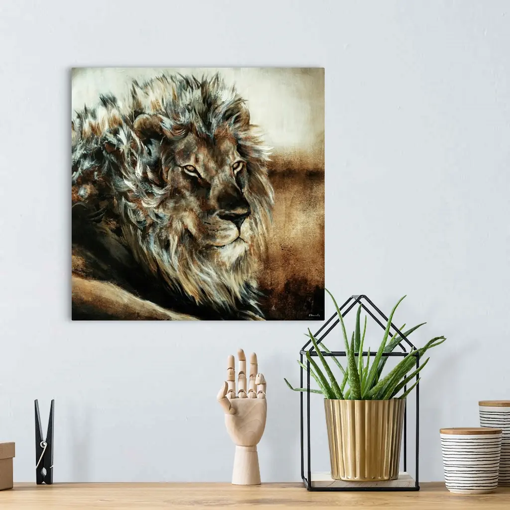 Oversized, square, fine art painting of the upper half of a male lion, using wispy brush strokes.