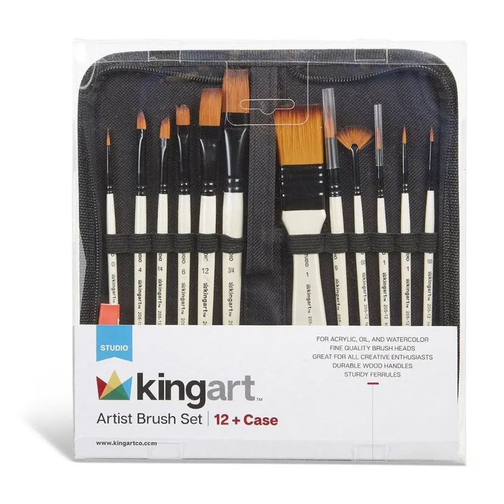 KINGART® STUDIO Artist Brushes + Case | Set of 12 12 essential brush types and sizes: Angular Shader – ¼”, Fan – 2/0, Filbert – 4, Flat – 6, 12, Wash – ¾”, 1”, Script Liner – 1, Round – 10/0, 0, 1, 6Designed for use with acrylic, watercolor and oil paintQuality synthetic bristles hold their shape and are easy to cleanDouble-crimped ferrule keeps bristles on the brush and out of your paintingWhite lacquered handles are crafted for comfort and durabilityDurable zippered carrying case holds brushes securelyQuality synthetic fibers that work well with all types of media These 12 mixed media brushes are perfect for aspiring enthusiasts and beginners looking to enjoy new levels of creativity. The KINGART® Heritage Our family has been exceeding the needs of the most demanding artists and enthusiasts for three generations. We delight in challenging the status quo and putting our experience to work for you.
