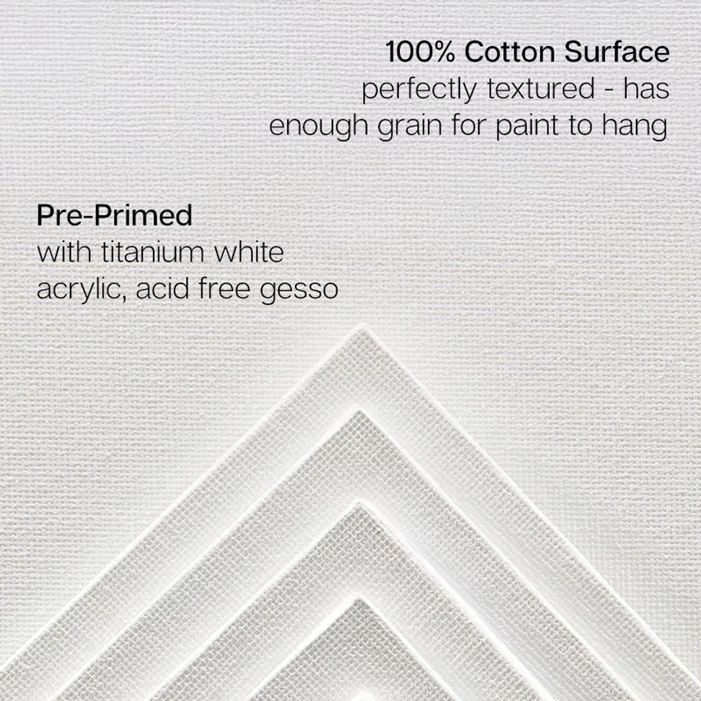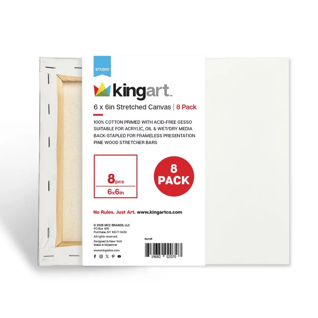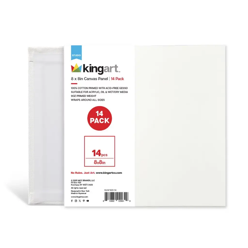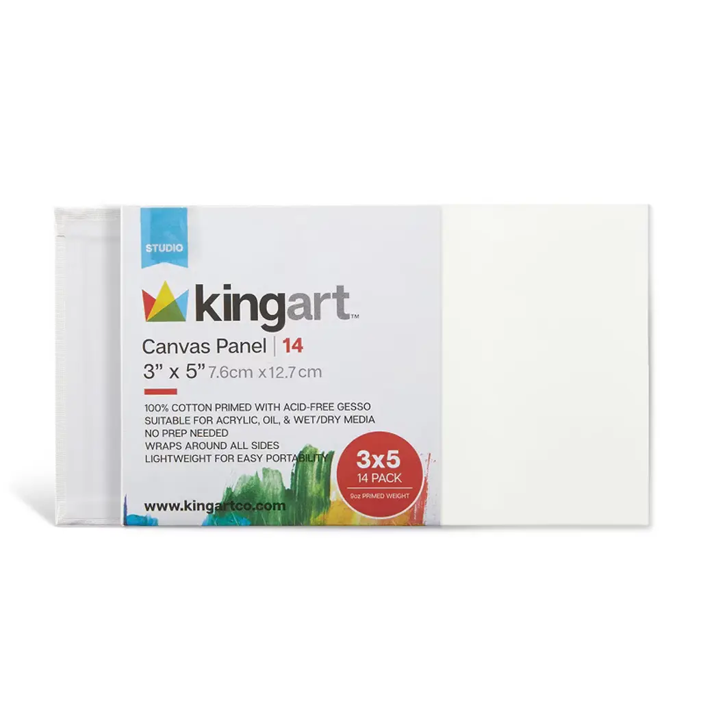KINGART® Canvas Panel 3 x 5 inch, 14-Pack 100% cotton canvas surface is lightly textured and primed with titanium white acrylic gessoUse for painting with oil and acrylic paints and pens as well as mixed media projects, collage, craft projects and more.Rigid backing board provides a firmer working surface than stretched canvasEasy to transport; Easy to store8 oz. primed weight, Acid free, Wraps around all sidesSet includes 14 canvas boards 3 x 5” Let your imagination run wild with our canvas panels. You'll have plenty of room to explore your creativity. Each canvas panel comes wrapped in plastic ensuring they'll be clean and white upon use. Our panels come pre-primed with acid-free titanium acrylic gesso, creating the most ideal surface that won't rob paint of their pigment, insuring their brilliant color for years to come. Give your acrylic, oil, and other wet or dry media the foundation they deserve. Conforms to ASTM D4234. This set includes (14) 3 x 5” canvas boards. Pre-Primed Canvas Board Pack – 14 panels with three coats of animal-friendly, acid-free titanium acrylic gesso Perfectly Textured- Smooth, 100% cotton surface with enough grain for the paint to hang from Lightweight & Less Bulky- Portable and ideal for most frame molding or metal frames The KINGART® Heritage Our family has been exceeding the needs of the most demanding artists and enthusiasts for three generations. We delight in challenging the status quo and putting our experience to work for you.
