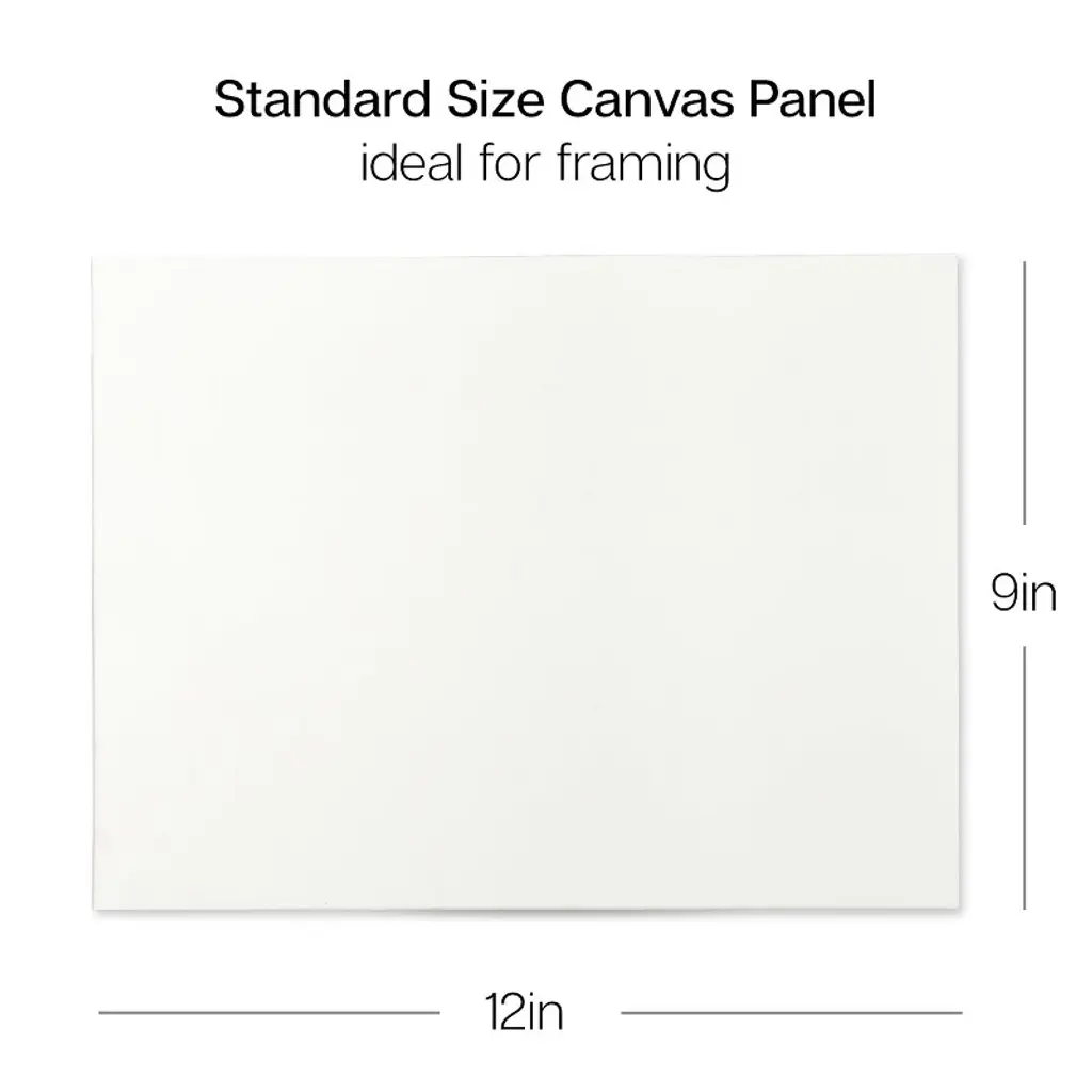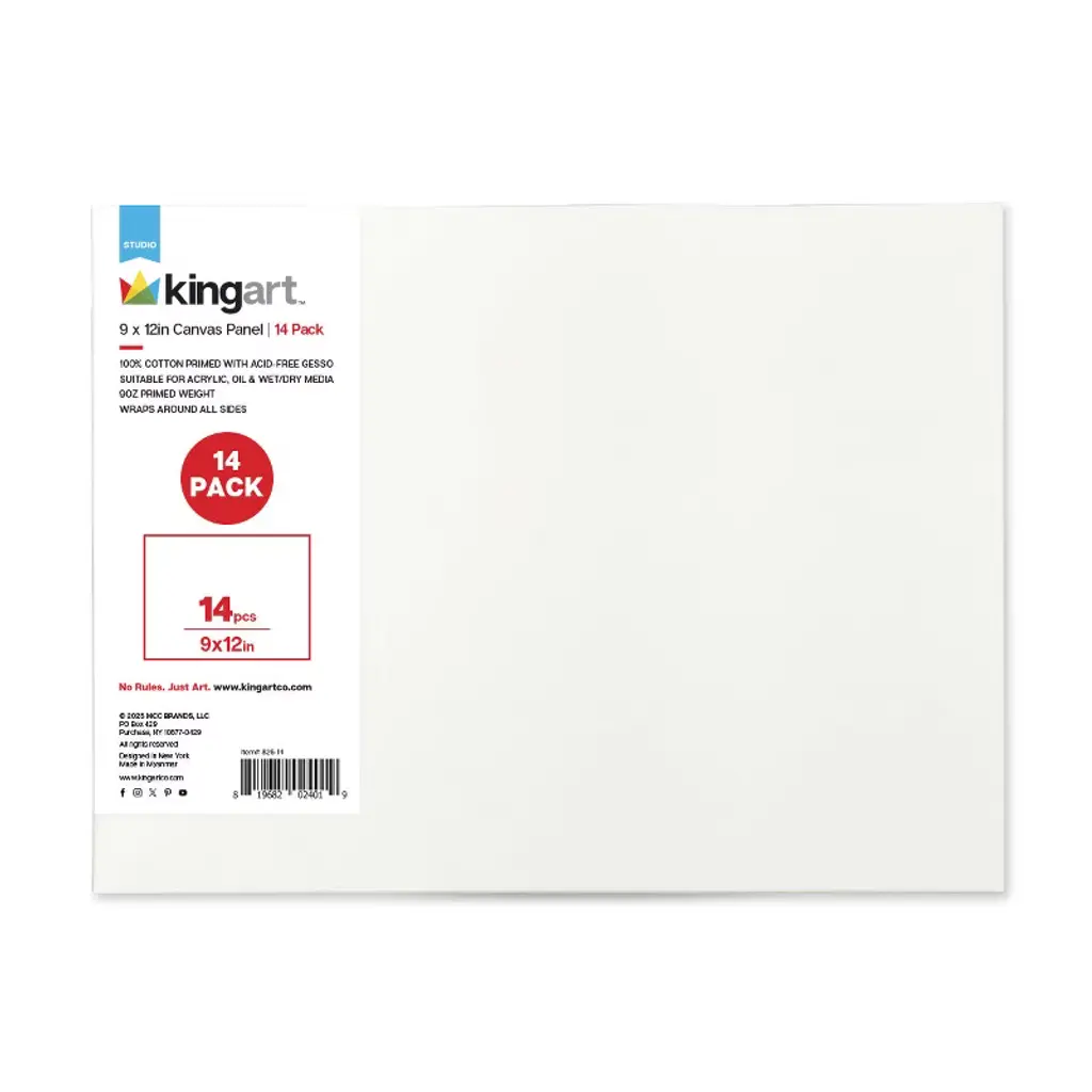 KINGART® Canvas Panel 9 x 12 inch, 14-Pack 100% cotton canvas surface is lightly textured and primed with titanium white acrylic gessoUse for painting with oil and acrylic paints and pens as well as mixed media projects, collage, craft projects and more.Rigid backing board provides a firmer working surface than stretched canvasEasy to transport; Easy to store8 oz. primed weight, Acid free, Wraps around all sides14 of each of size 9” x 12" canvas boards. Let your imagination run wild with our canvas panels. You'll have plenty of room to explore your creativity. Each canvas panel comes wrapped in plastic ensuring they'll be clean and white upon use. Our panels come pre-primed with acid-free titanium acrylic gesso, creating the most ideal surface that won't rob paint of their pigment, insuring their brilliant color for years to come. Give your acrylic, oil, and other wet or dry media the foundation they deserve. Conforms to ASTM D4234. This set includes (14) 9 x 12” canvas boards. Pre-Primed Canvas Board Pack – 14 panels with three coats of animal-friendly, acid-free titanium acrylic gesso Perfectly Textured- Smooth, 100% cotton surface with enough grain for paint to hang from Lightweight & Less Bulky- Portable and ideal for most frame molding or metal frames The KINGART® Heritage Our family has been exceeding the needs of the most demanding artists and enthusiasts for three generations. We delight in challenging the status quo and putting our experience to work for you.
