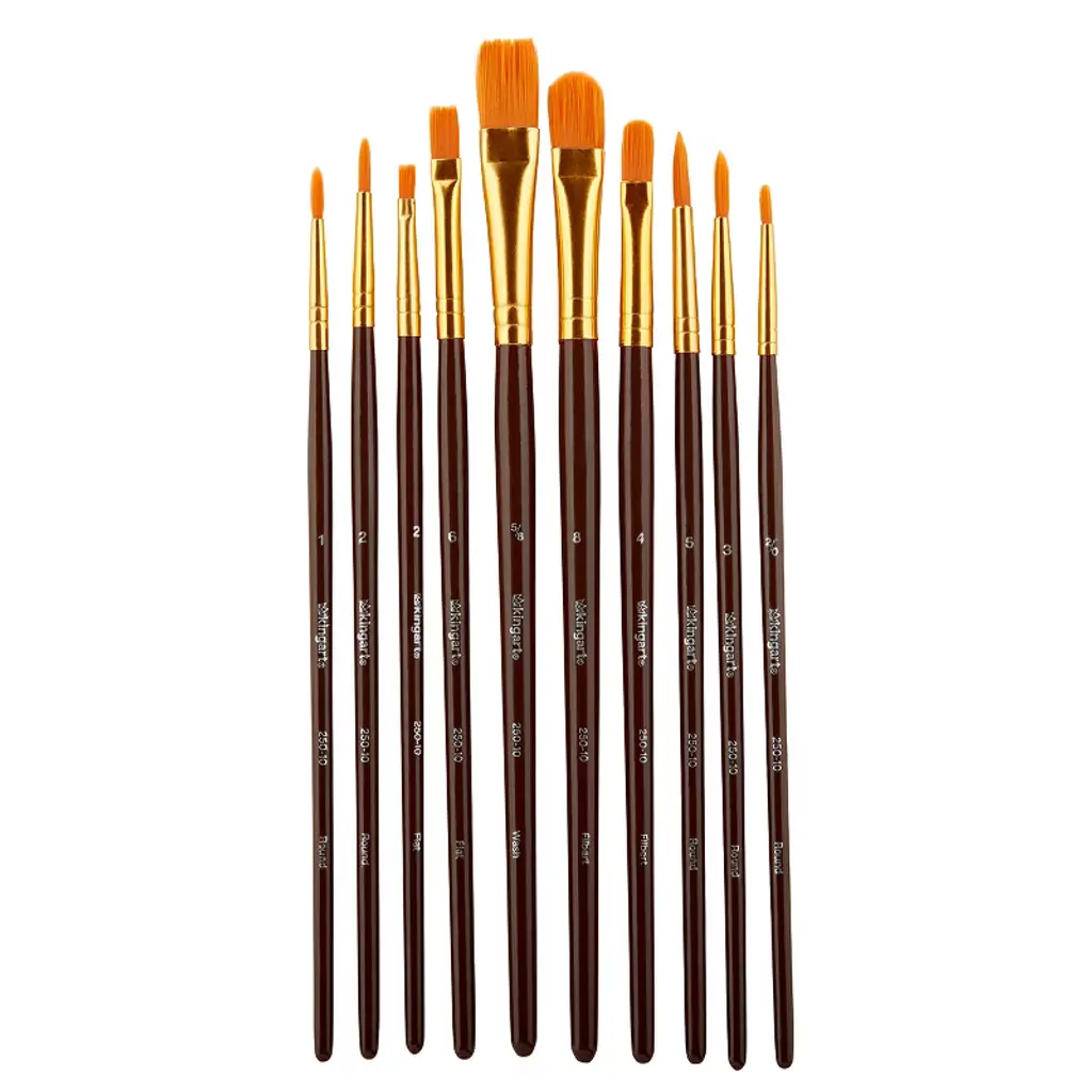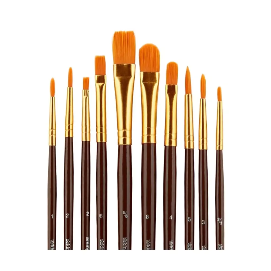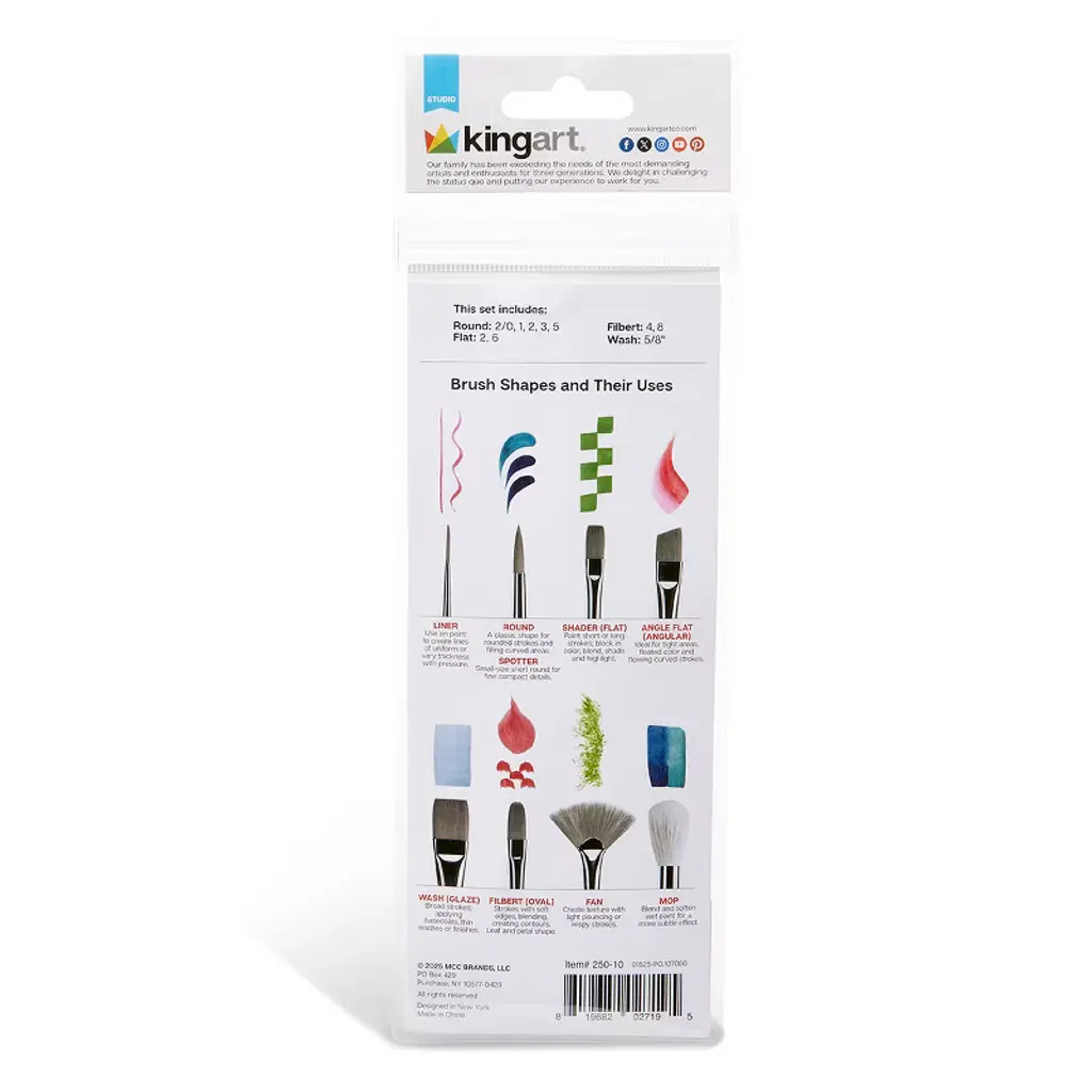 KINGART® KINGART® Studio Paint Brushes, Set of 10 Full range of brushes, including rounds, flats and filbertsDesigned for use with acrylic, watercolor, gouache and oil paintGreat for body art & face painting Quality synthetic bristles hold their shape and are easy to cleanDouble-crimped ferrule keeps bristles on the brush and out of your paintingShort wooden handles are crafted for comfort, control and durabilityBrushes included are: Rounds: 3/0, 1, 2, 5, 3 - Flats: 2, 6 - Filberts: 4, 8 - Wash: 5/8" These brushes include a wide range of size and are perfect for aspiring enthusiasts and beginners looking to enjoy new levels of creativity and complete projects large and small. About KINGART No Rules. Just Art. Not just a tagline on KINGART packages but a belief fundamental to our core and mission to support the need for individual expression with creative materials covering a host of visual media. Founded in 2017, the DNA of the KINGART® brand has a rich heritage and our family has been exceeding the needs of the most ambitious artists and enthusiasts for three generations. We delight in challenging the status quo and putting our experience to work for you because art is for everyone!