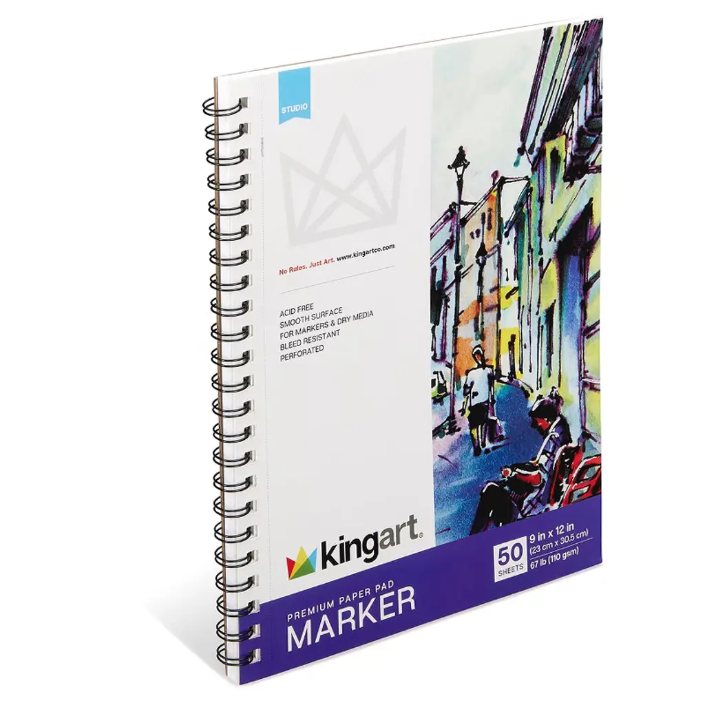 KINGART Marker Paper Pad, Spiral Bound, 9 x 12 Inches, 50 Sheets, 67lb/110 gsm, Acid-Free & Perforated Cold-Pressed Texture: The smooth surface is ideal for Markers and PensBleed Resistant: Colors won't bleed or runAcid-Free Paper: Ensures your artwork remains vibrant over time without yellowing or deterioration.Generous Size: 9 x 12 inches for larger compositions or the option to trim to desired sizes.Perforated Edges: Easily detach your finished work for framing or sharing. The KINGART® Heritage For generations, KINGART® has been dedicated to creating art supplies that elevate your creative experience. Whether you're exploring new techniques or refining your skills, our products are crafted to bring your artistic vision to life.