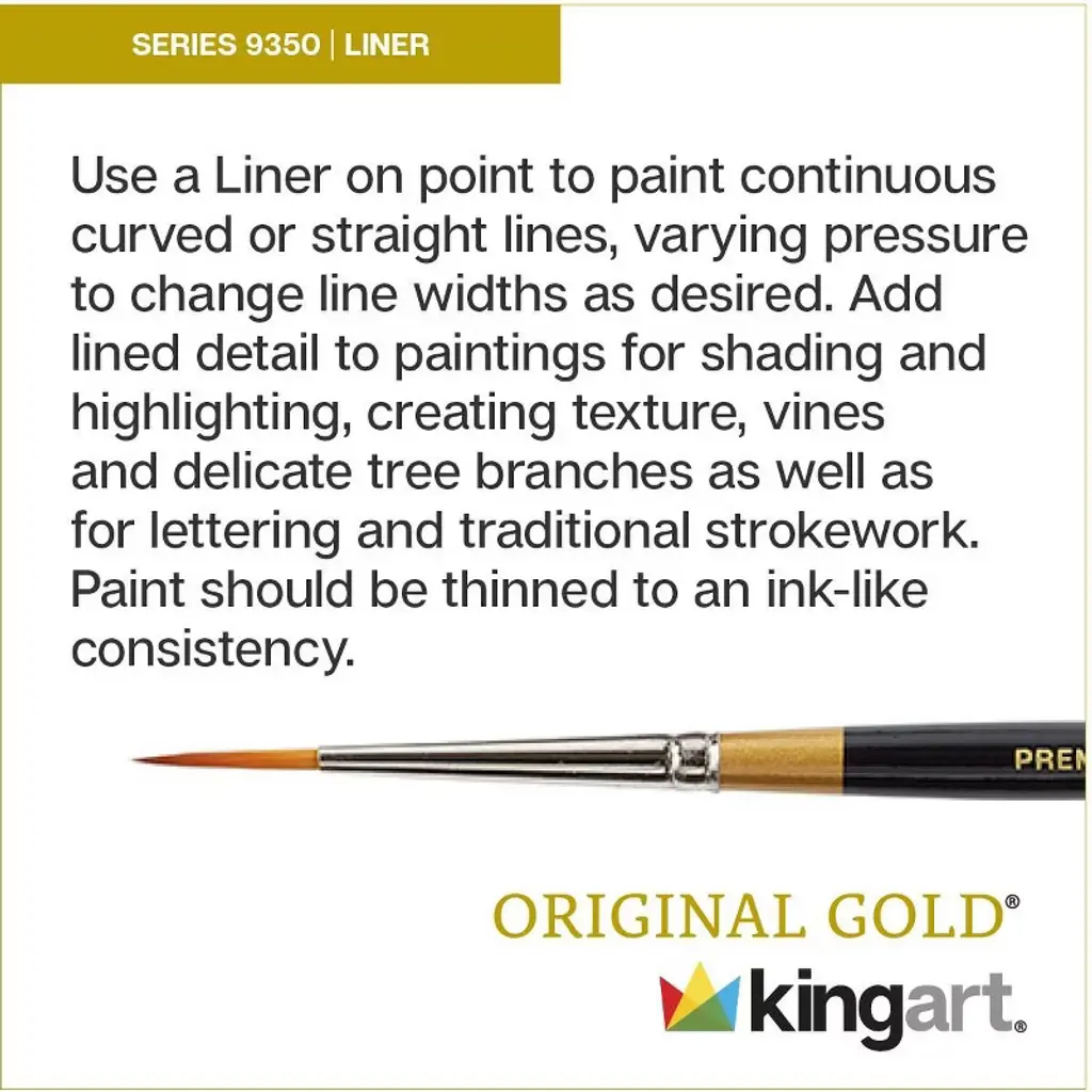 KINGART® Original Gold® 9350 Liner Series, Premium Golden Taklon Multimedia Artist Brushes, Painting Tools for Oil, Acrylic, Watercolor and Gouache, Set of 7 Original Gold® 9350 Liner – Size 18/0Original Gold® 9350 Liner – Size 10/0Original Gold® 9350 Liner – Size 2/0Original Gold® 9350 Liner – Size 0Original Gold® 9350 Liner – Size 1Original Gold® 9350 Liner – Size 2Original Gold® 9350 Liner – Size 4 The Original Gold® 9350 Golden Taklon Liner brushes have long, slender bristles that come to a precise point. The resiliency of these liners allows them to snap back to their original shape after use. Great for creating consistent lines with precision. Perfect for a variety of detail work as well. Enhance your painting with detail lines, outlining or fancy borders. Liner brushes with their long length hair and fine points are the ideal tool. Paint should be thinned to an inky consistency so that it flows easily from the brush. Use for continuous curved or straight lines, varying thickness with pressure changes with highlighting, monogramming, outlining, stroke work, or texture lines. About Original Gold® ® developed the best quality paintbrush for oil, acrylic, watercolor, and gouache painting. These brushes lend themselves beautifully to fine detailing, blocking, shading, lettering, applying washes and more. Each brush style is designed with its own special blend of luxury synthetic filaments for greater versatility, enhanced color-holding capacity, and precise color placement.This brush was designed with versatility as its main feature with exceptional snap, superior absorption, and fluid retention. It’s excellent for use both with watercolor, oil, and acrylic, allowing artists to create fine details as well as providing superior performance for coloring large areas and backgrounds.KINGART™ Original Gold series synthetic brushes are made from the finest-quality Golden Taklon filaments to create brush heads that are remarkably durable, easy to care for and versatile, they work equally well with watercolor, acrylic, and oil paint. Each brush is expertly crafted to mimic the virtues of sable hair, including exceptional paint-holding capacity.Thanks to the perfect combination of three different diameters and three lengths in the fibers, the brushstroke’s result is the same as one made of natural hair. Each brush holds its shape well and consists of filaments that are dyed and baked to increase softness and absorption. You will be amazed at how well they hold their shape.The filaments of each brush are bound together with nickel-plated brass ferrules and crimped at the bottom to ensure an extra-secure bond to the handle. Each handle is ergonomically crafted to reduce muscle fatigue and are carefully balanced to provide maximum control. Original Gold® artist brushes from KINGART® feature a metallic gold ring and gloss black handle with silver crimped nickel-plated ferrules.KINGART® Original Gold® offers a wide range of affordable, durable, and vegan-friendly essential, specialty and miniature brushes. Whether you're a seasoned professional, or just learning to paint, you can't go wrong with these exceptional premium artist paint brushes.KINGART® brushes are designed with the artist in mind and are manufactured to survive years of steady use. A KINGART® PREMIUM brush makes all the difference in the world! Additional Details: Exclusive artisanal process, using the best materials, and the finishing of the expert hands of three generations of brush makersKINGART® premium artist brushes are always handcrafted Premium quality for mixed media applicationsFinest-quality Golden Taklon filament for best performanceThree different diameters and three lengths in the fibers allows for great control over paint techniquesSynthetic filament has been baked for softness and optimal absorptionExceptional spring and you will be amazed at how well they hold their shape when cared for properly Vegan-Friendly 100% synthetic filamentHandcrafted products are green. Work done by hand takes less energy than a mass production assembly line, which makes it more environmentally sustainable.Collection features a wide variety of shapes and sizesFeatures gloss black handle with gold ring with round seamless silver crimped nickel-plated ferrule Brush sizes: The length and width of a brush of a given shape and size may vary by manufacturer as brush sizes are not standardized. Since fine art brushes are handmade, expect some variation even among brushes from within a single brush line.The KINGART® Heritage: Our family has been exceeding the needs of the most demanding artists and enthusiasts for three generations. We delight in challenging the status quo and putting our experience to work for you.