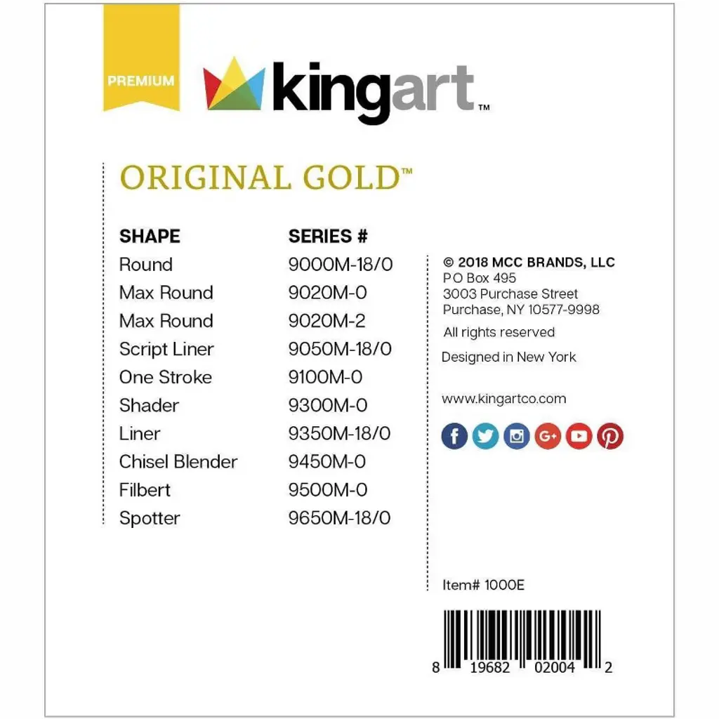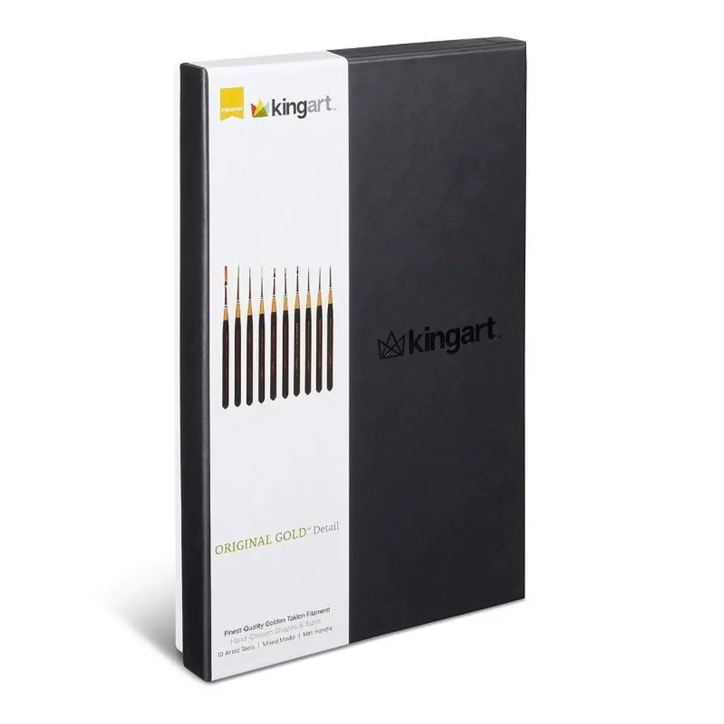 KINGART® Original Gold® Miniature Detail Series, Comfort Handle, Premium Golden Taklon, 100% Synthetic, Multimedia Artist Brushes, Painting Tools for Oil, Acrylic, Watercolor and Gouache, Gift Box, Set of 10 About Original Gold® Miniature Detail Series™ These Miniature Detail painting tools are built for precision! Ideal for painting miniatures, dollhouses, models, jewelry, nails, and wildfowl art. KINGART® Original Gold® Miniature Detail brushes are also great for airbrush detailing and decorative painting of all kinds. The compact, detail fine heads on these short-handled brushes make them perfect for working in tight spaces, while their Comfort Grip handles eliminate finger cramping during long painting sessions. KINGART® Original Gold® Miniature Detail brushes feature long-lasting synthetic Golden Taklon filaments encased in seamless, nickel-plated brass ferrules, for superb control with acrylics, watercolors, inks, gouache, enamel paints, or oils. This collection includes: Original Gold® 9000M Round – Size 18/0Original Gold® 9020M Ultra Round – Size 0Original Gold® 9020M Ultra Round – Size 2Original Gold® 9050M Script Liner – Size 18/0Original Gold® 9100M One Stroke – Size 0Original Gold® 9300M Shader – Size 0Original Gold® 9350M Liner – Size 18/0Original Gold® 9450M Chisel Blender – Size 0Original Gold® 9500M Filbert – Size 0Original Gold® 9650M Spotter – Size 18/0 Additional Details: Miniature Detail: These brushes were created for artists who use watercolor or acrylic paint. They feature golden taklon filaments mounted onto comfort grip handles. Their fine detail tips are good for creating tiny details and offer lots of control.MATERIALS: Our Miniature paint brushes are expertly crafted with luxurious and precise golden taklon filaments. Each brush has a short comfort grip handle that is finished with a sophisticated nickel-plated brass ferrule.DETAILING BRUSH SET: This kit includes wide assortment of ten (10) detail brushes PAINT: Each Miniature brush can be paired with both watercolor and acrylic paint, proving that it is versatile. It will hold the right amount of color for precise details. Enjoy the controlled, colorful strokes. Additional Details: Exclusive artisanal process, using the best materials, and the finishing of the expert hands of three generations of brush makersKINGART® premium artist brushes are always handcrafted Premium quality for mixed media applicationsFinest-quality Golden Taklon filament for best performanceThree different diameters and three lengths in the fibers allows for great control over paint techniquesSynthetic filament has been baked for softness and optimal absorptionExceptional spring and you will be amazed at how well they hold their shape when cared for properly Vegan-Friendly 100% synthetic filamentHandcrafted products are green. Work done by hand takes less energy than a mass production assembly line, which makes it more environmentally sustainable.Collection features a wide variety of shapes and sizesBrush sizes: The length and width of a brush of a given shape and size may vary by manufacturer as brush sizes are not standardized. Since fine art brushes are handmade, expect some variation even among brushes from within a single brush line.The KINGART® Heritage: Our family has been exceeding the needs of the most demanding artists and enthusiasts for three generations. We delight in challenging the status quo and putting our experience to work for you.