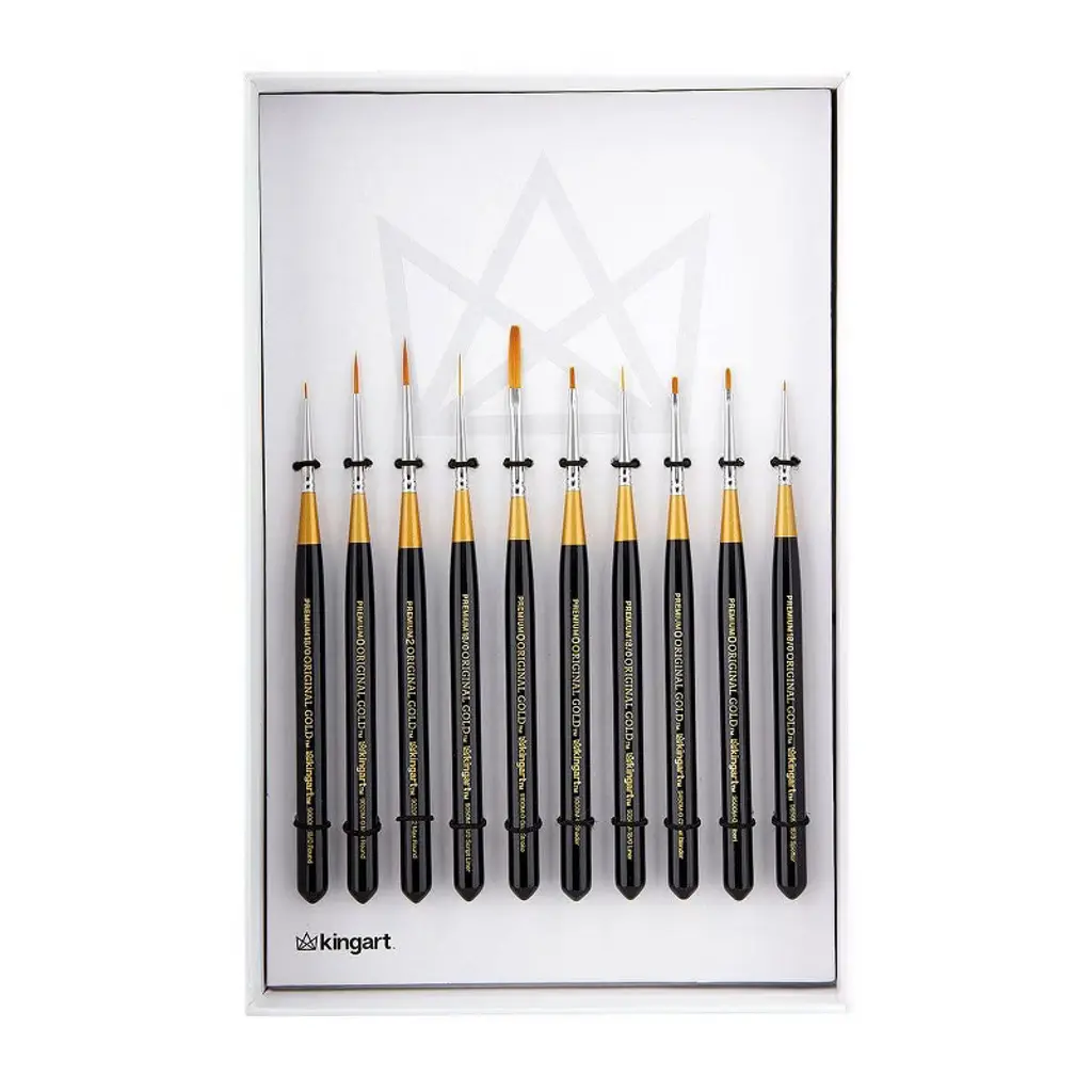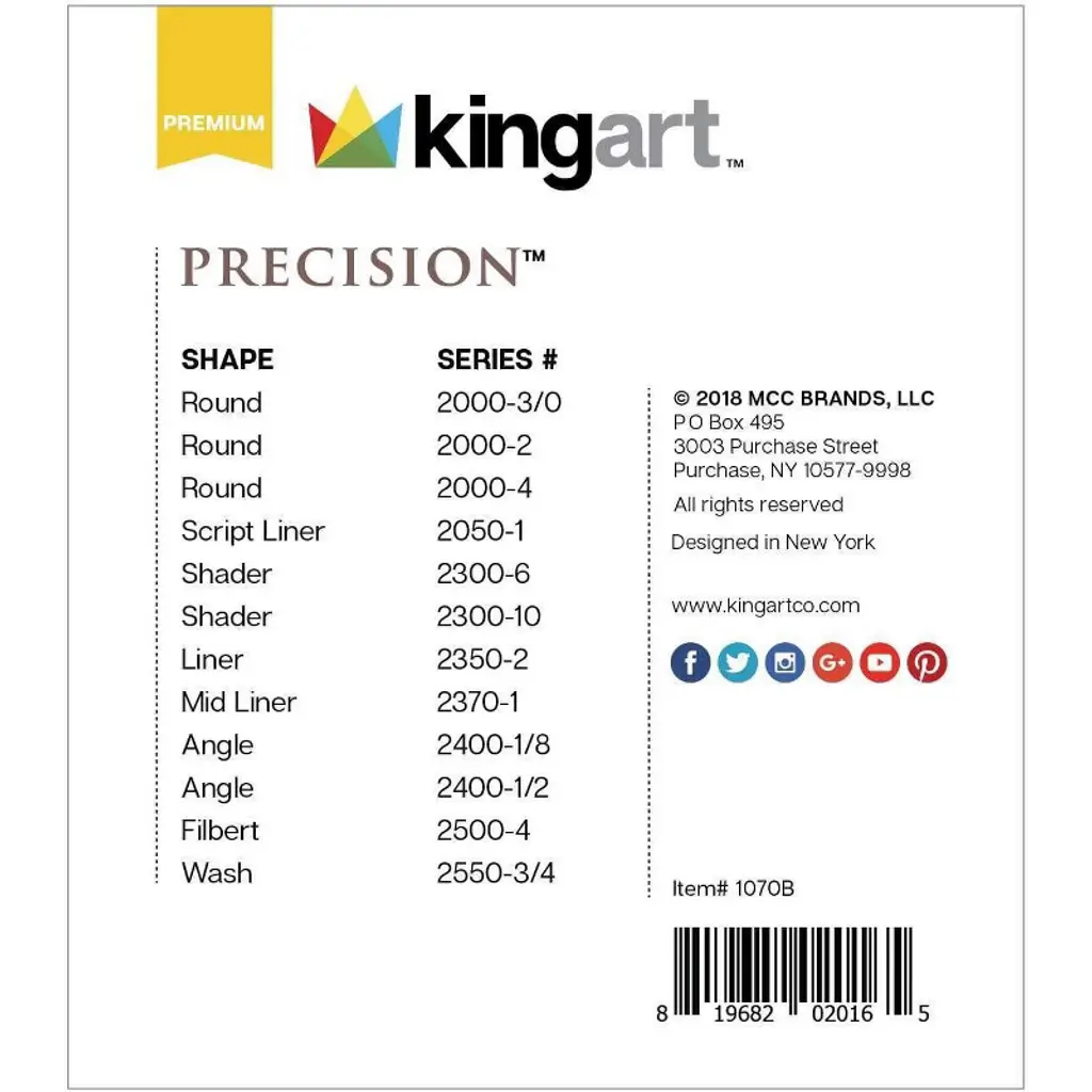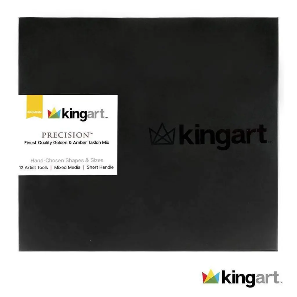 KINGART® Precision™ Series Amber Taklon Brushes, Ergonomic Comfort Handle, Gift Box, Set of 12 This collection includes: Precision™ Series Angle Shader, Series 2400-1/8Precision™ Series Filbert, Series 2500-4Precision™ Series Shader, Series 2300-6Precision™ Series Round, Series 2000-3/0Precision™ Series Round, Series 2000-2Precision™ Series Round, Series 2000-4Precision™ Series Liner, Series 2350-2Precision™ Series Mid Liner, Series 2370-1Precision™ Series Script Liner, Series 2050-1Precision™ Series Shader, Series 2300-10Precision™ Series Angle Shader, Series 2400-1/2Precision™ Series Wash, Series 2550-3/4 KINGART® Precision™ Brushes are built for use with all mediums, these brushes hold their shape and have the KINGART® signature "snap" (you feel the brush head snap softly while painting). Each brush is made with premium ergonomic wood handles for maximum painting comfort and control. Handles feature a chocolate brown gloss handle with metallic silver in the groove along with nickel-plated ferrules. Choose from a variety of Precision™ short handle brush sets & paint for hours with our beautiful ergonomic comfort grip handles. • Finest-Quality Blend of Golden Taklon & Amber Taklon Filament • Hand-chosen shapes and sizes with short handles• Built for all mediums• Brush head holds shape well with KINGART® signature "snap"• Ergonomic handle relieves hand fatigue and provides greater control• Features chocolate brown gloss handle with metallic silver in the groove KINGART® premium brush sets come with each individual brush sewn into a branded brush card and packaged in a luxury gift box Brush sizes — The length and width of a brush of a given shape and size may vary by manufacturer as brush sizes are not standardized. Since fine art brushes are handmade, expect some variation even among brushes from within a single brush line. The KINGART® Heritage Our family has been exceeding the needs of the most demanding artists and enthusiasts for three generations. We delight in challenging the status quo and putting our experience to work for you.