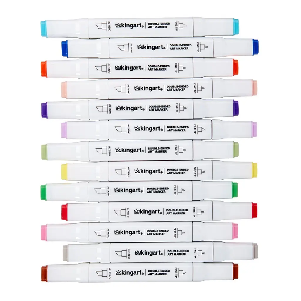 KINGART® PRO Double-Ended Sketch Markers, Chisel & Fine Tip, Alcohol-Based Ink, Clear Travel/Storage Case, Set of 60 Unique Colors Set of 60 unique colorsRich & vibrant colors Alcohol-based formulation Richly saturated color Fine point lays down sharp lines Chisel tip creates line widthsColor Match as tips share single ink reservoirSingle source of ink guarantees color consistencyColor Coded CapsSuperior BlendabilityClear travel/storage case NON-Toxic & Conforms to ASTM D-4236 Broad strokes or fine lines, you choose with KINGART® PRO Double-Ended Art Markers. Our Pro Level alcohol-based inks are richly saturated for brilliant color and smooth blending. Great for illustrations and other artwork, KINGART® professional-quality art and drawing supplies can help you fill in every detail with just the right color, whether you're an art student, a hobbyist, or an experienced designer. The single reservoir ensures consistent color and an easy, effortless flow. Great for illustration and any art project. Create beautifully accomplished illustrations and artwork with the 60-pack of KINGART® PRO Double-Ended Art Markers. These double-ended sketch markers are fit with a broad chisel tip and fine tip. For your convenience, each marker’s color is labeled on both cap ends. Our Art Markers perform best on high weight paper that is bleedproof, uncoated, and smooth. Suitable for beginning and experienced artists, these premium artist markers offer a range of colors and are dual-tipped, with a fine tip at one end for precise lines and a chisel at the other for coverage and broad strokes. The color-coded caps have ridges to prevent the markers from rolling off table. Incredibly versatile, these double-ended drawing markers feature a fine tip on one end for sharp, detailed lines and a smooth chisel on the other for multiple widths. The unique design lets you quickly and easily switch between precise work and full coverage The KINGART® Heritage Our family has been exceeding the needs of the most demanding artists and enthusiasts for three generations. We delight in challenging the status quo and putting our experience to work for you.