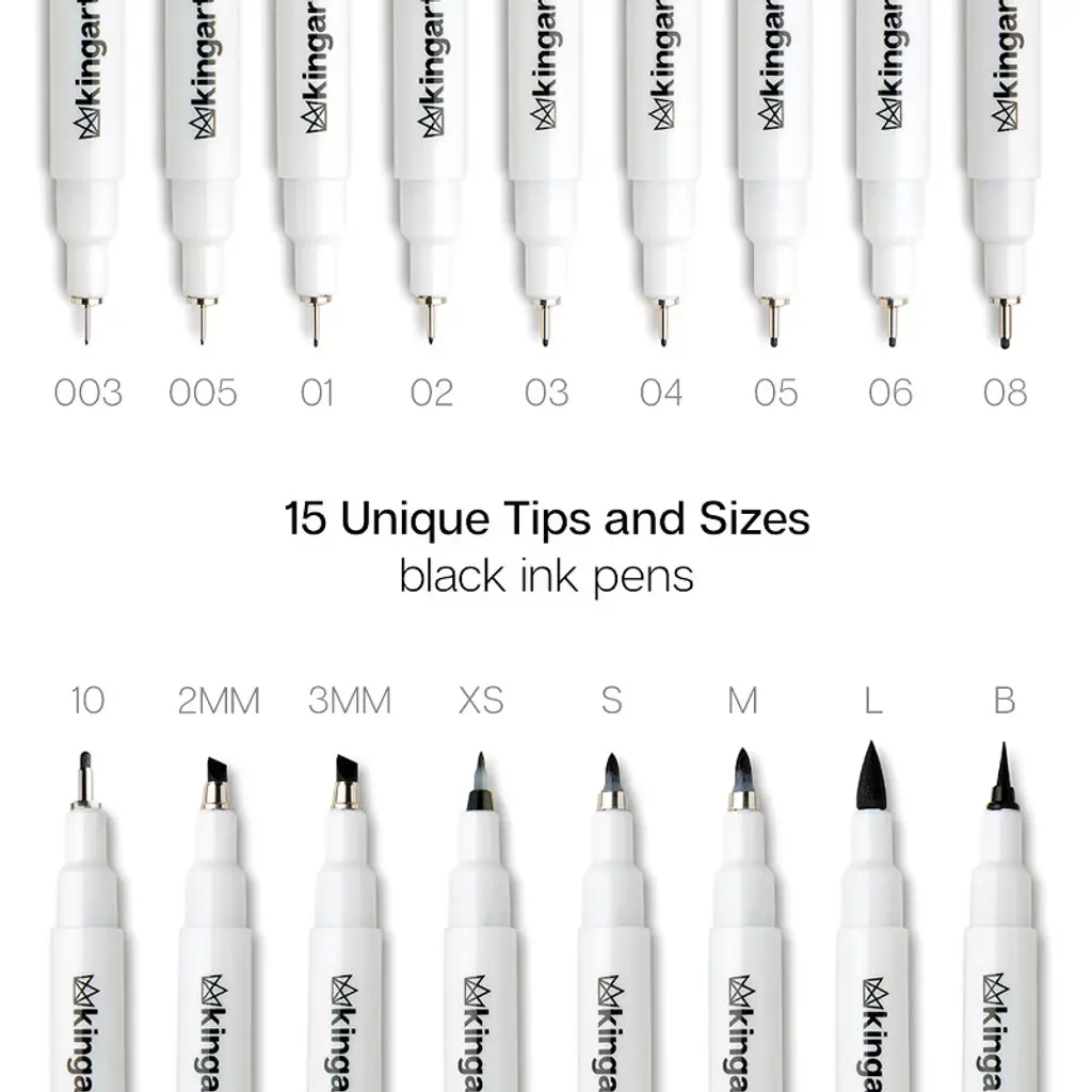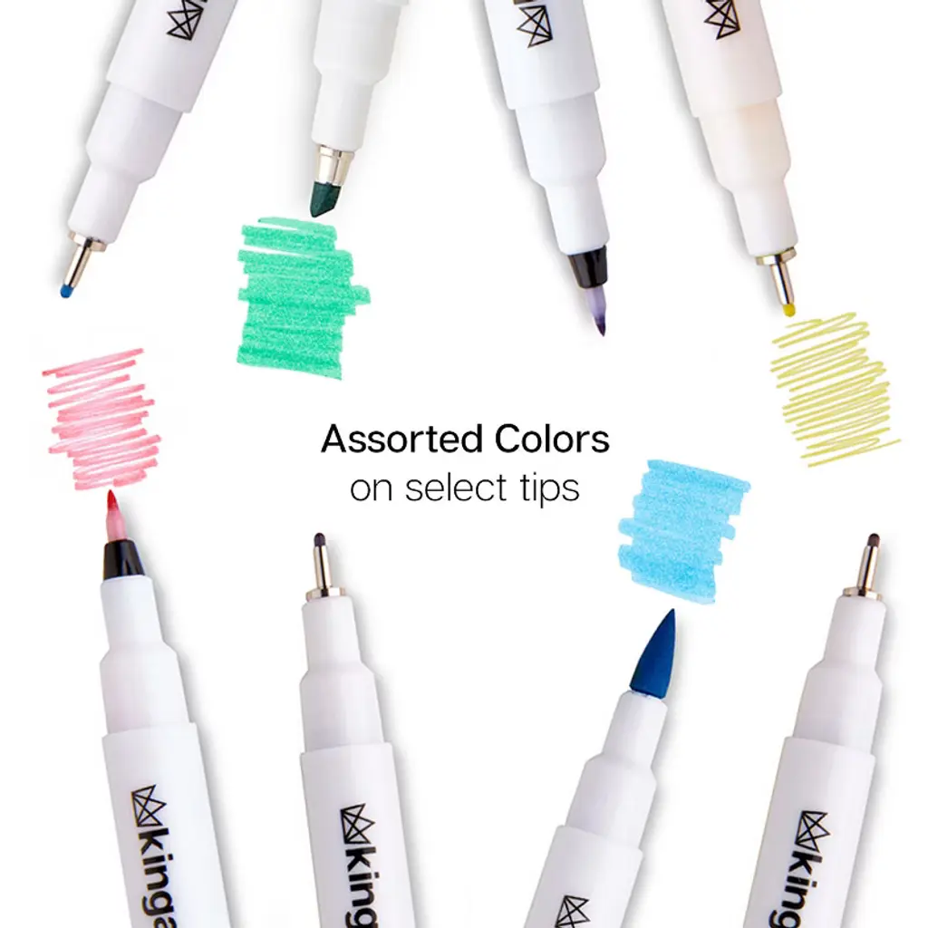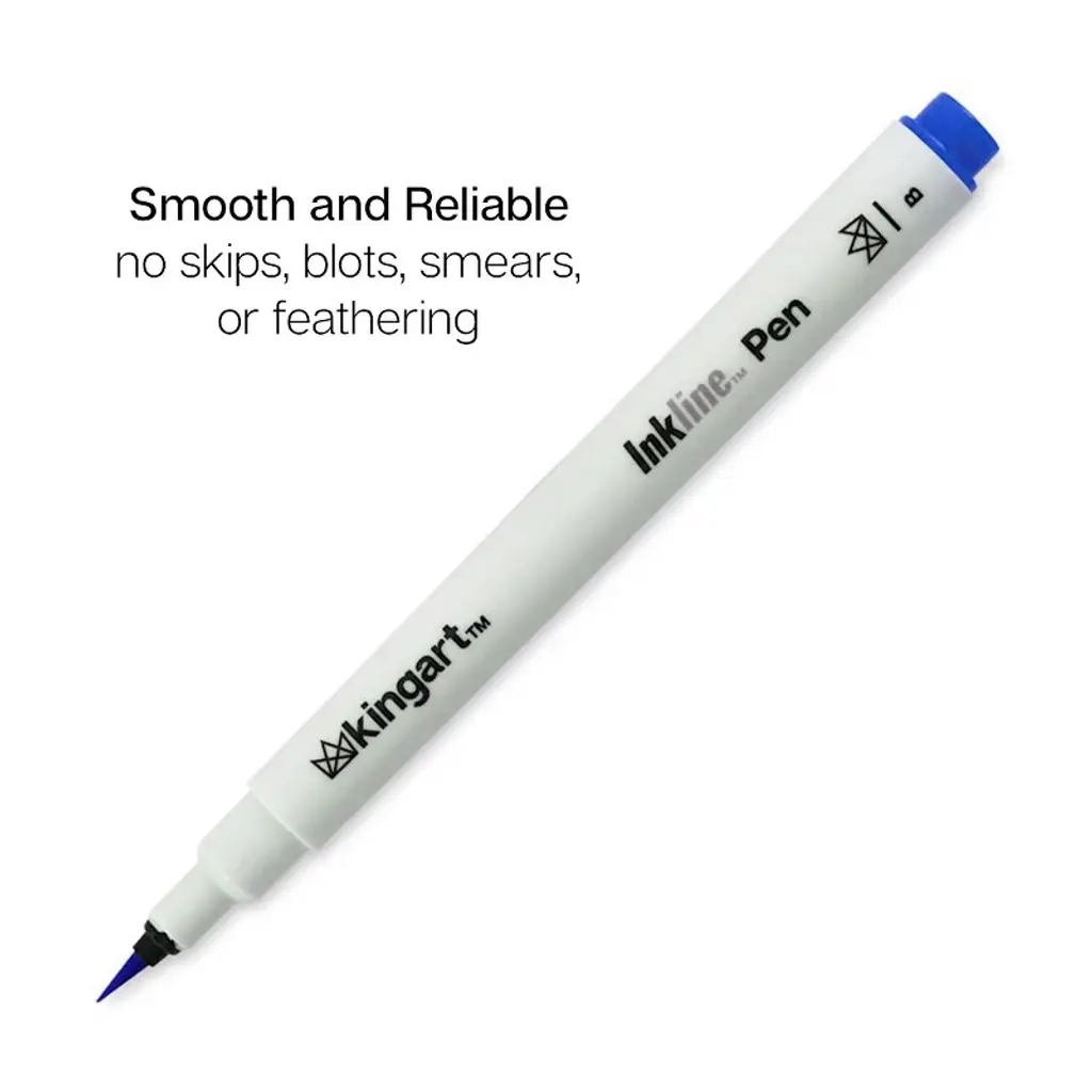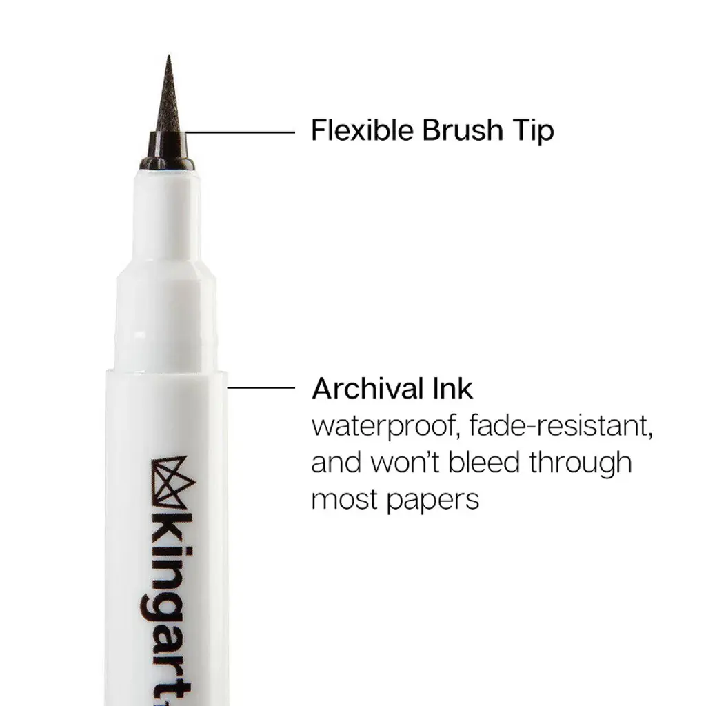 KINGART® Inkline™ Fine Line Art & Graphic Brush Pens, Archival Ink, Set of 8 Vivid Colors Flexible PRO tips combine the precision of a fine pen with the expressive power of an artist’s brushEight vivid colors, including blackArchival ink is waterproof, fade-resistant, and won’t bleed through most papersSmooth and reliable—no skips, blots, smears, or featheringNon-toxic and conforms to ASTM D-4236 Perfect for professionals as well as aspiring artists. KINGART® Inkline™ Artists Pens are smooth, reliable, and filled with rich, vibrant, permanent color. The waterproof, non-toxic, archival ink is fade-resistant and won't bleed through most papers. No feathering, skipping, or blotting! Use KINGART® Inkline™ Artists Pens to draw and color detailed illustrations, add elegant calligraphy and freehand artwork to scrapbooks and fabric projects, create playful drawings filled with color, or produce precise technical drawings with confidence The flexible PRO brush tips respond instantly as you move from fine lines to bold brush strokes. The archival ink colors are vivid and permanent. Eight colors are included in this set (see below). Colors included in this set: Red, Rose, Orange, Green, Blue, Purple, Brown, Black The KINGART® Heritage Our family has been exceeding the needs of the most demanding artists and enthusiasts for three generations. We delight in challenging the status quo and putting our experience to work for you.