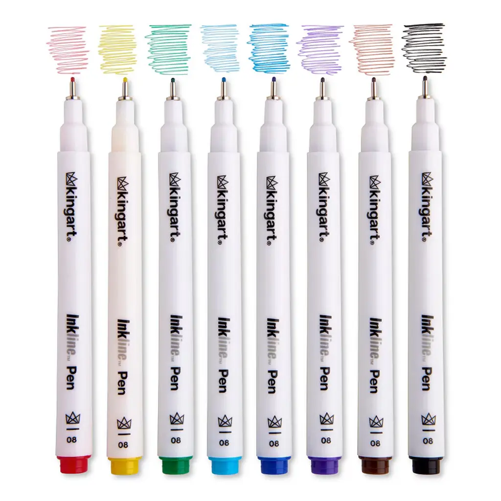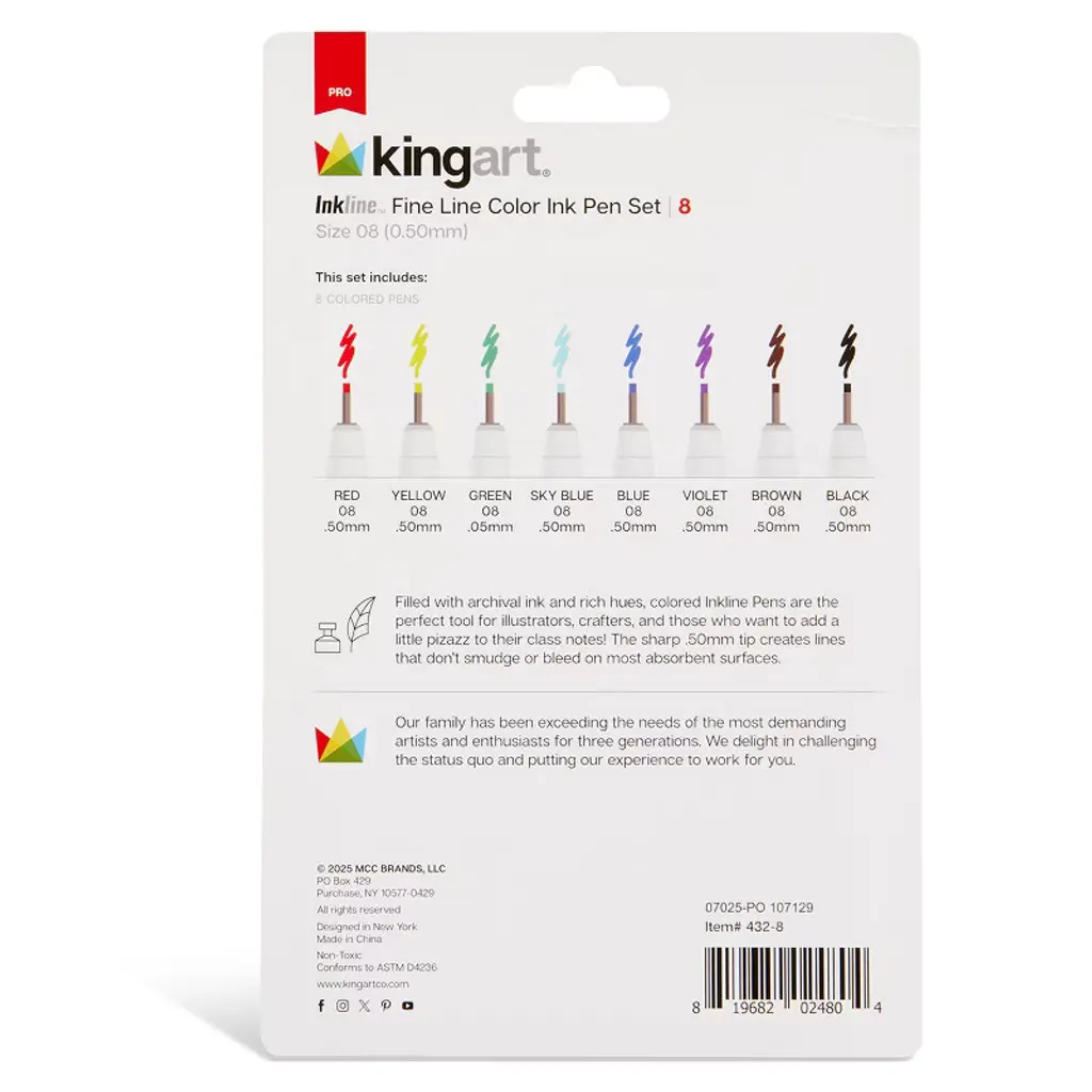 KINGART® Inkline™ Fine Line Art & Graphic Pens, Archival Ink, Set of 8 Unique Colors, Size 08 Eight Pens Size 08 (.50mm) in 8 colors Archival ink is waterproof, fade-resistant and won’t bleed through most papersSmooth and reliable—no skips, blots, smears or featheringUse for lettering, journaling, inking, cartooning, graphic design & drawingApplicable for all from novice to expertArchival ink is acid-freeSmooth and reliable—no skips, blots, smears or featheringNon-toxic and conforms to ASTM D-4236 Perfect for professionals as well as aspiring artists, KINGART® Inkline™ Artists Pens are smooth, reliable, and filled with rich, vibrant, permanent color. The waterproof, non-toxic, archival ink is fade-resistant and won't bleed through most papers. No feathering, skipping, or blotting! The fine tip pens draw precise width & thickness, while the brush tip pens combine the precision of a fine tip pen with the expressive power of an artist's brush. Use KINGART® Inkline™ Artists Pens to draw and color detailed illustrations, add elegant calligraphy and freehand artwork to scrapbooks and fabric projects, create playful drawings filled with color, or produce precise technical drawings with confidence Assorted Colors Size 08 RedOrangeYellowGreenSky BlueBlueVioletBlack The KINGART® Heritage Our family has been exceeding the needs of the most demanding artists and enthusiasts for three generations. We delight in challenging the status quo and putting our experience to work for you.