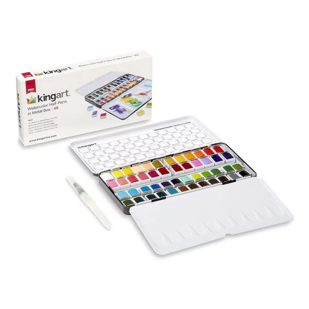 KINGART® PRO Artist Watercolor Half-Pans, Tin Box with Water Brush, Set of 48 Vibrant Colors Professional painting set48 unique & highly pigmented shadesSet includes refillable water brush pen with flexible nylon tipBlank swatch card included An ideal paint set for traveling or field sketch paintingTerrific for travel, artist on the go or in studio Quick drying eliminates the long wait time associated with letting your watercolor layers drySuperior choice of bright and vivid pigmentsThe high pigmentations of our watercolors allows this set a long-lived addition to your watercolor paint collectionThese solid watercolor paints are easily removed and inserted into the metal tin, by which you could always replace these watercolors with the colors you prefer.Perfect gift for professional artists, watercolor painters, students, beginners, crafters & hobbyists. Comes in a protective metal box that doubles as a handheld palette Reusable even after they dry, just add a drop of water and you can continue creating artwork full of fresh, vibrant colorSet comes in a beautiful color box with color chart Buy for yourself or as an incredible gift for all occasions from graduation, holiday, birthday and more. Non-Toxic and Conforms ASTM D-4236 The KINGART® PRO "professional" watercolor set can meet the requirements of a highly skilled artist and the art student providing the best "true to color" watercolor experience. The colors are bright, rich, transparent, soluble, easy to blend, fade-resistant, and create endless colors when mixed together. Exquisitely designed metal tin with a thumb ring on the bottom and foldout palette, features midnight black enamel exterior and white enamel interior, shining and sturdy and easy to wipe clean, just fits your hand. Our Artist Paint Half Pans Set of 48 is the perfect watercolor set for any painter. This set comes complete with 48 brilliantly beautiful and vibrant colors that are sure to impress any artist. The vibrant colors are incredibly pigmented, providing artists with rich color every time. Note - Original Gold brush in photograph not included. The KINGART® Heritage Our family has been exceeding the needs of the most demanding artists and enthusiasts for three generations. We delight in challenging the status quo and putting our experience to work for you.