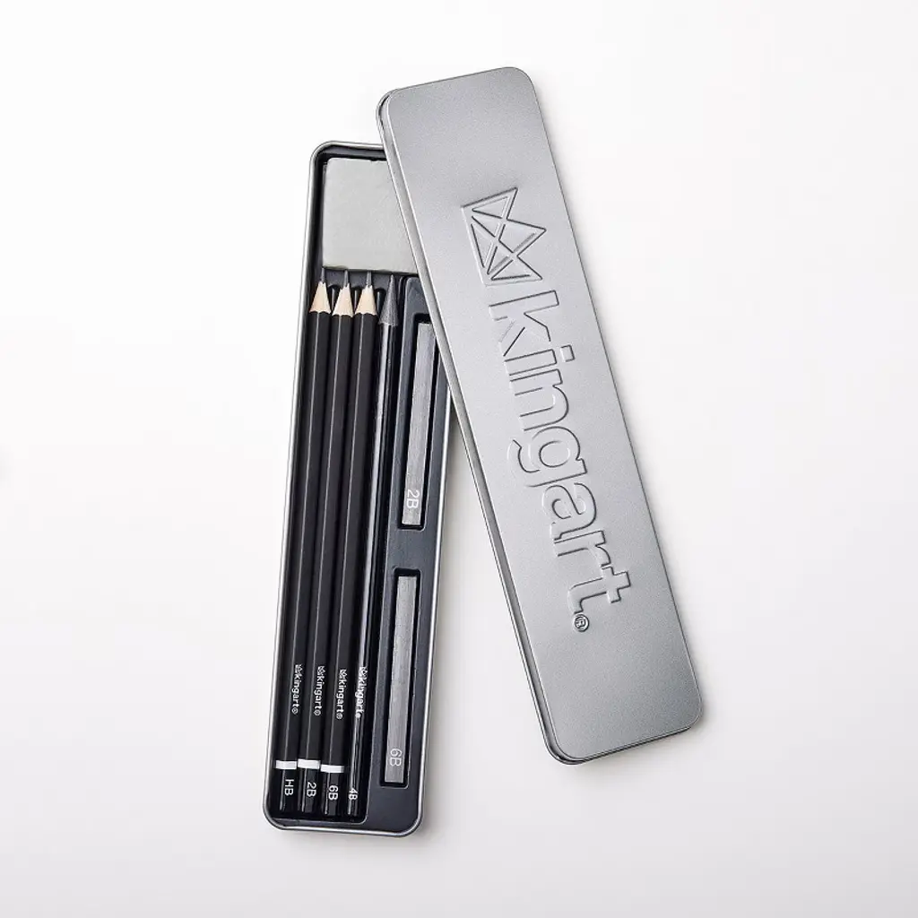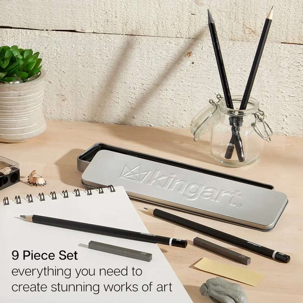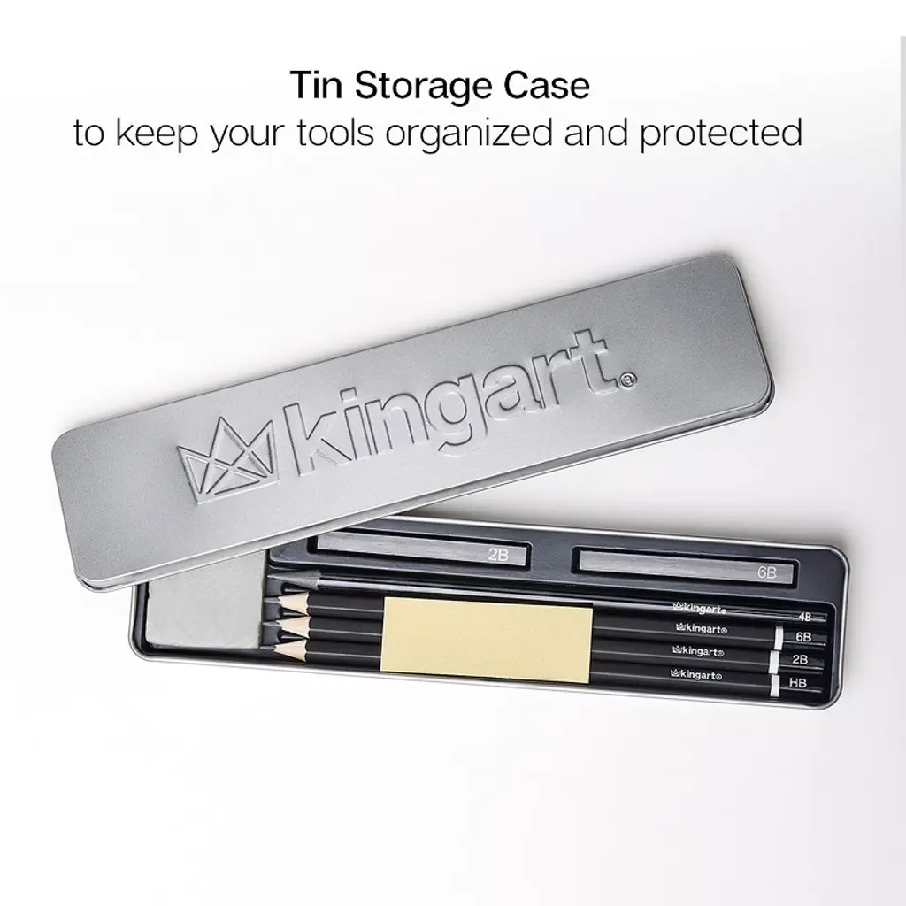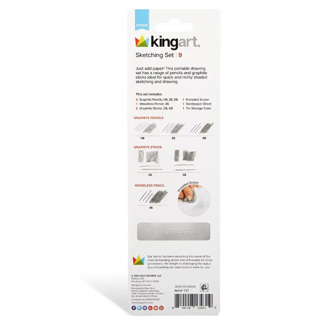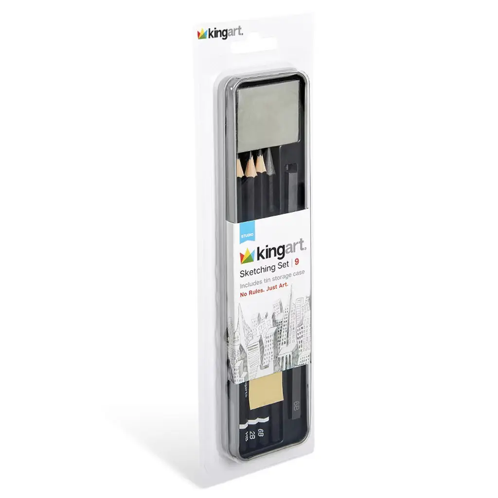 KINGART® Sketching & Drawing Travel Tin, 9 pcs. 3 Graphite Pencils: HB, 2B, and 6B for varying degrees of hardness and darkness.1 Woodless Pencil: 4B for precise control and smooth lines.2 Graphite Sticks: 2B and 6B for blending, shading, and creating unique effects.1 Kneaded Eraser: Ideal for removing pencil marks without leaving smudges.1 Sandpaper Sheet: For sharpening your pencils to a perfect point.1 Tin Storage Case: To keep your tools organized and protected. Elevate your drawing experience with this comprehensive art set, featuring a wide range of essential tools. Whether you're a beginner or a seasoned artist, this set has everything you need to create stunning works of art. With this versatile set, you'll have the freedom to explore your creativity and bring your artistic visions to life. About KINGART No Rules. Just Art. Not just a tagline on KINGART packages but a belief fundamental to our core and mission to support the need for individual expression with creative materials covering a host of visual media. Founded in 2017, the DNA of the KINGART® brand has a rich heritage and our family has been exceeding the needs of the most ambitious artists and enthusiasts for three generations. We delight in challenging the status quo and putting our experience to work for you because art is for everyone!