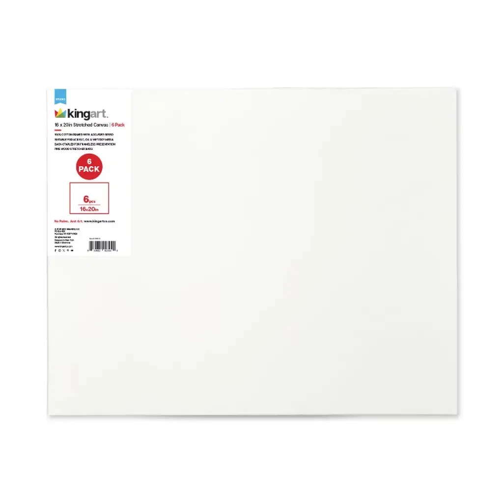 KINGART® Stretched White Canvas 16" x 20", 100% Cotton, Back Stapled, Gesso-Primed, 6-Pack 100% Cotton, medium grainPrimed with 3 coats of acrylic, acid free gessoPine wood stretcher bars5/8" profile & back stapled Pulled tightly & well securedCanvas weight with primer is 280 gsmPackage contains 6 units of 16" x 20" stretched canvasApplicable for beginners to professionals & in betweenAcrylic and Oil painting applications.Ideal for fine art, DIY projects, crafts, collage, decorative painting & more Smooth clean white surfaceConforms to ASTM D-4236 Ready. Set. Go. From Painting to Pouring to Airbrushing & Texture Art! These ample sized 16" x 20" pre-primed canvas' are ready for you to paint and decorate. Our stretched canvas is the perfect choice for paint applications, studies, and class projects. Primed with three coats acid-free acrylic titanium gesso. Our surface is ready to use with acrylic paint, oil paint, and other wet or dry media. Perfectly Textured - 100% cotton surface has enough grain for paint to hang from and is ideal for many types of Media and mediums. Each large stretched canvas in this set is pre-coated with acid-free acrylic gesso. Start painting and creating as soon as you remove the wrapper. The KINGART® Heritage Our family has been exceeding the needs of the most demanding artists and enthusiasts for three generations. We delight in challenging the status quo and putting our experience to work for you.