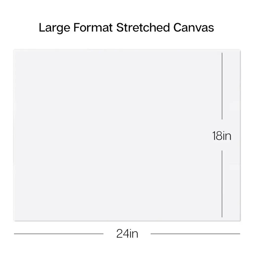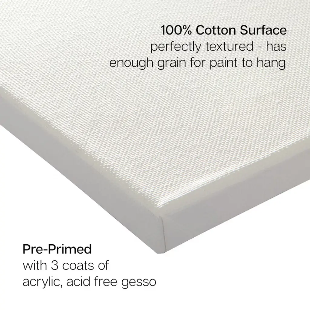 KINGART® Stretched White Canvas 18" x 24", 100% Cotton, Back Stapled, Gesso-Primed, 4-Pack 100% Cotton, medium grainPrimed with 3 coats of acrylic, acid free gessoPine wood stretcher bars5/8" profile & back stapled Pulled tightly & well securedCanvas weight with primer is 280 gsmPackage contains 4 units of 18" x 24" stretched canvasApplicable for beginners to professionals & in betweenAcrylic and Oil painting applications.Ideal for fine art, DIY projects, crafts, collage, decorative painting & more Smooth clean white surfaceConforms to ASTM D-4236 Ready. Set. Go. From Painting to Pouring to Airbrushing & Texture Art! Our stretched canvas is the perfect choice for all paint applications, studies, and class projects. Primed with 9 oz. of acid-free acrylic titanium gesso. Our surface is ready to use for acrylic paint, oil paint, and other wet or dry media. Pre-Primed Canvas Pack – 18 x 24" canvases with three coats of animal-friendly, acid-free titanium acrylic gesso Perfectly Textured - Smooth, 100% cotton surface with enough grain for paint to hang from Sturdy & Reliable - Durable pinewood stretcher bar holds your canvas firmly Wet & Dry Media - Versatile and designed for a variety of paints and techniques Cotton Surface Ideal for Many Types of Media: - The stretched canvas can be used with a wide variety of artist media, from oil and acrylic to watercolor, ink, tempera, and gouache. Ready to Create - Each large stretched canvas in this set is pre-coated with acid-free acrylic gesso. Start painting and creating as soon as you remove the wrapper. The KINGART® Heritage Our family has been exceeding the needs of the most demanding artists and enthusiasts for three generations. We delight in challenging the status quo and putting our experience to work for you.