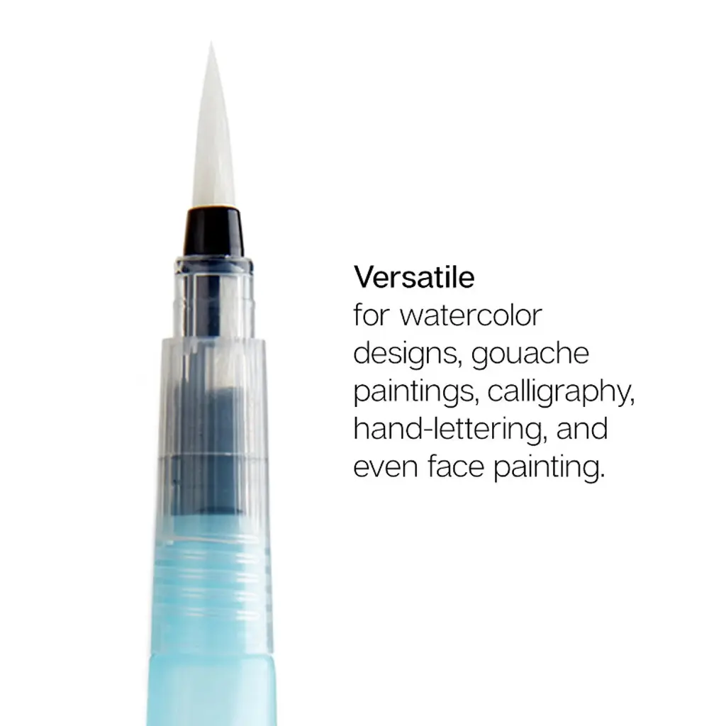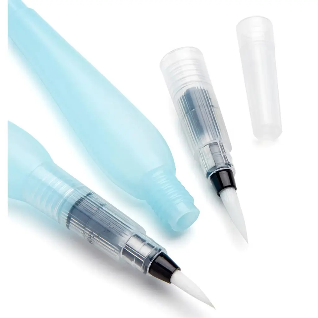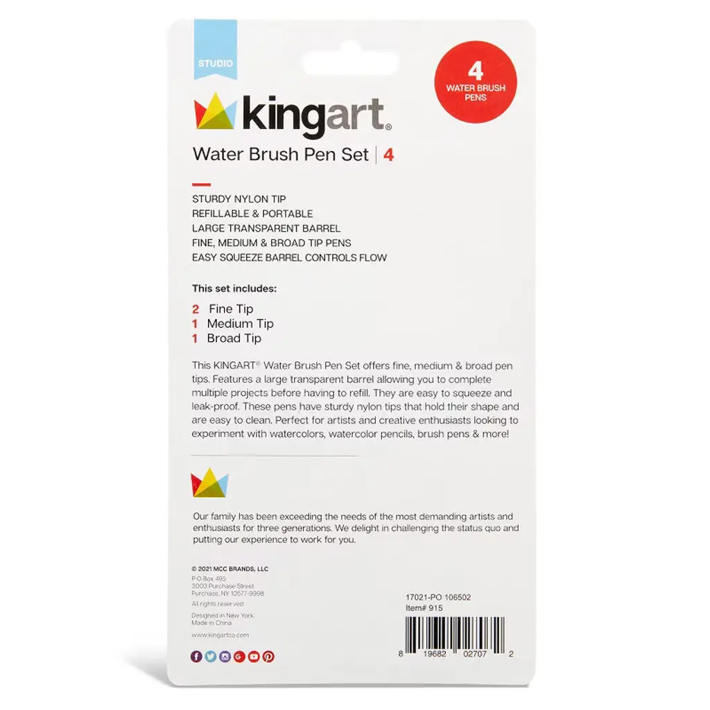 KINGART® Studio Water Brush Pens, Set of 4 Assorted Tips Assorted Tips - Includes 4 fine-tip water brush pens that hold their shape and produce versatile strokesPrecise Water Flow - Provides maximum comfort and water flow controlPortable - Easily portable and self-moistening for use with all water-based mediaVersatile - With a large capacity barrel, these water brush pens are perfect for watercolor designs, calligraphy, hand-lettering, and face painting Our Water Brush Pens features an assortment of nylon brush tip sizes, offering artists every brush they need to create stunning masterpieces. This set of water brush pens comes complete with 4 fine-tip water brush pens that hold their shape and produce versatile strokes. Our versatile water brush pens are ideal for watercolor designs, gouache paintings, calligraphy, hand-lettering, and even face painting. Such versatile brushes are typically hard to come by for such an affordable rate. The easy-to-squeeze design makes getting the exact amount of water with your water brush pens possible every time. Our water brush pens are incredibly portable and make creating works of art on the go hassle and mess-free. These self-moistening, water brush pens with nylon brush tips can be used for all water-based media. Whether you prefer to work with ink, gouache, watercolor, or even face/body paint, this set of 4 water brush pens can do it all; see for yourself by ordering yours today. KINGART® Water Brush Pens deliver the exact amount of water every time, to ensure your paintings don’t get ruined by a reckless paint brush.