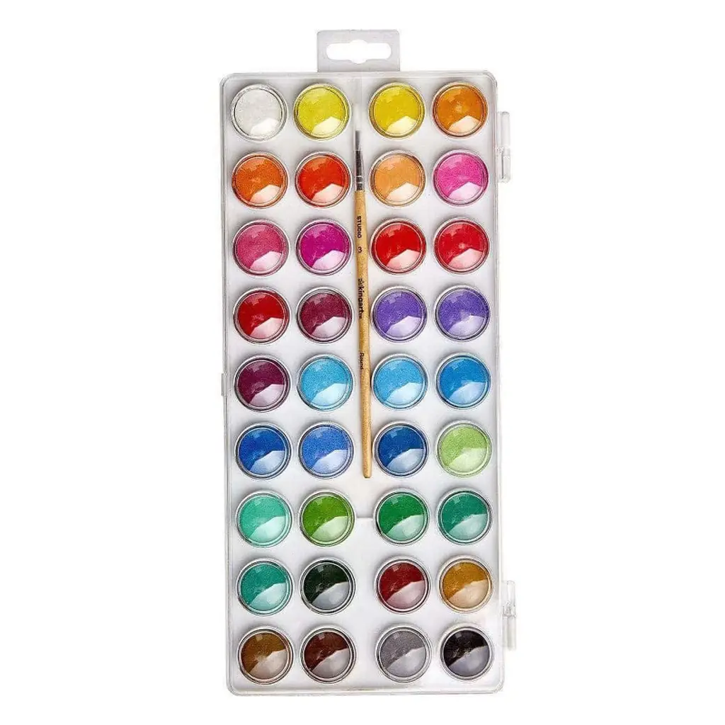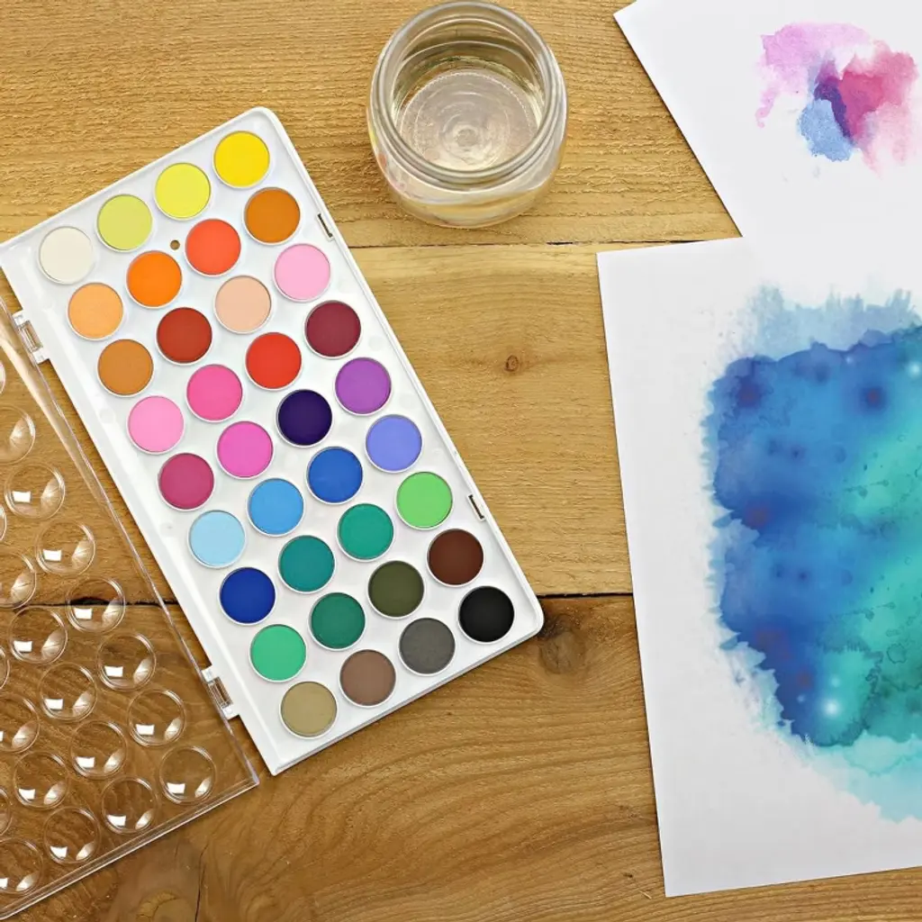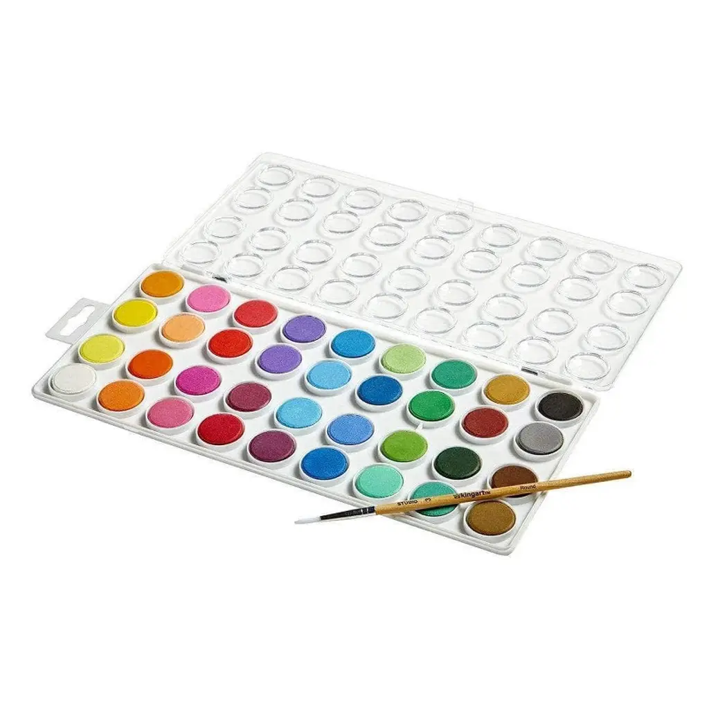 KINGART® Watercolor Pan Set 36 Opaque watercolor palette with a round white nylon brush is great for beginners to seasoned artists. Great starter set for any aspiring artist. Gift it to your favorite enthusiast for birthdays, holidays or just because.Packaged in a sturdy giftable box with a window showcasing the vibrant colors. Portable, sturdy plastic storage case is ideal for travel and holds a brush as well as the paint. From Yellow to True Blue, Green to Brown this water soluble paint set includes a wide selection of premium opaque colors across the color spectrum.Recommended for anyone who enjoy arts and crafts including students and teachers looking for quality and value.All the watercolors in the set are non-toxic. Paint for as long as you like without having to worry about fumes or irritation to your skin.Set includes a durable, top-quality white nylon brush so you can start painting straight away. Includes 36 Unique Colors & Paint Brush Pan watercolors are compact, convenient and versatile for watercolor art as well as multi-media, stamping and other decorative arts. Simply wet your brush and rub over the dry pan to release pigment into your brush. Paint, rinse and repeat! 36 colors provide a wide color palette and can be further mixed for limitless possibilities. The KINGART® Heritage Our family has been exceeding the needs of the most demanding artists and enthusiasts for three generations. We delight in challenging the status quo and putting our experience to work for you.