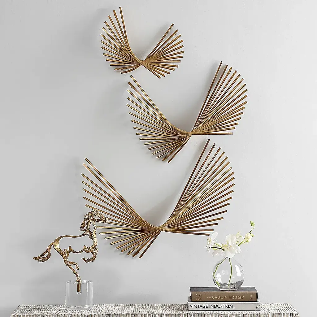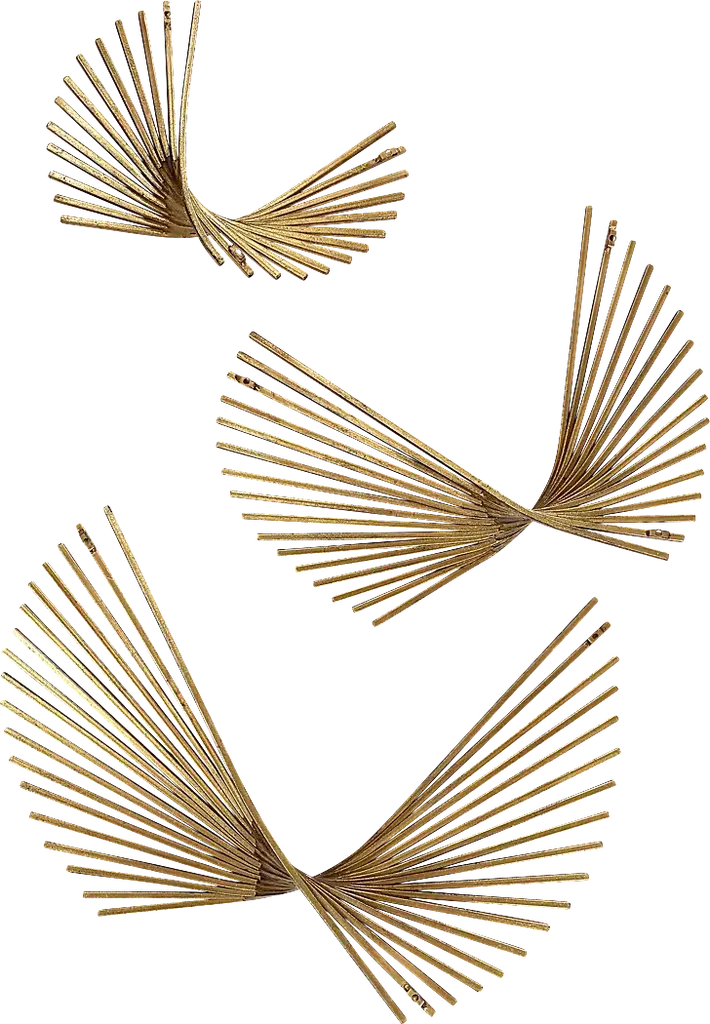 In this Kiril wall art, wisps of three-dimensional iron sculptures appear to be floating, giving creative freedom of display. Finished in antique gold leaf. May hang in any direction.