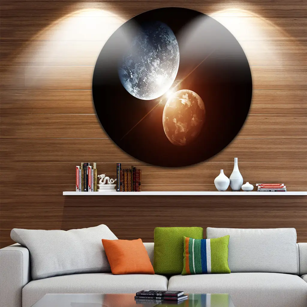Kiss Between Two Planets, Modern Spacescape Round Metal Wall Art, 38"