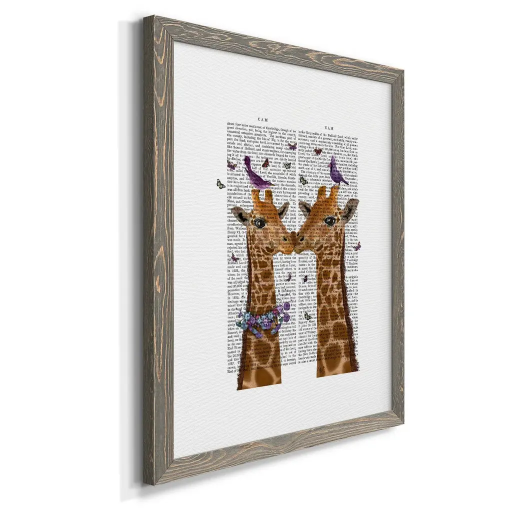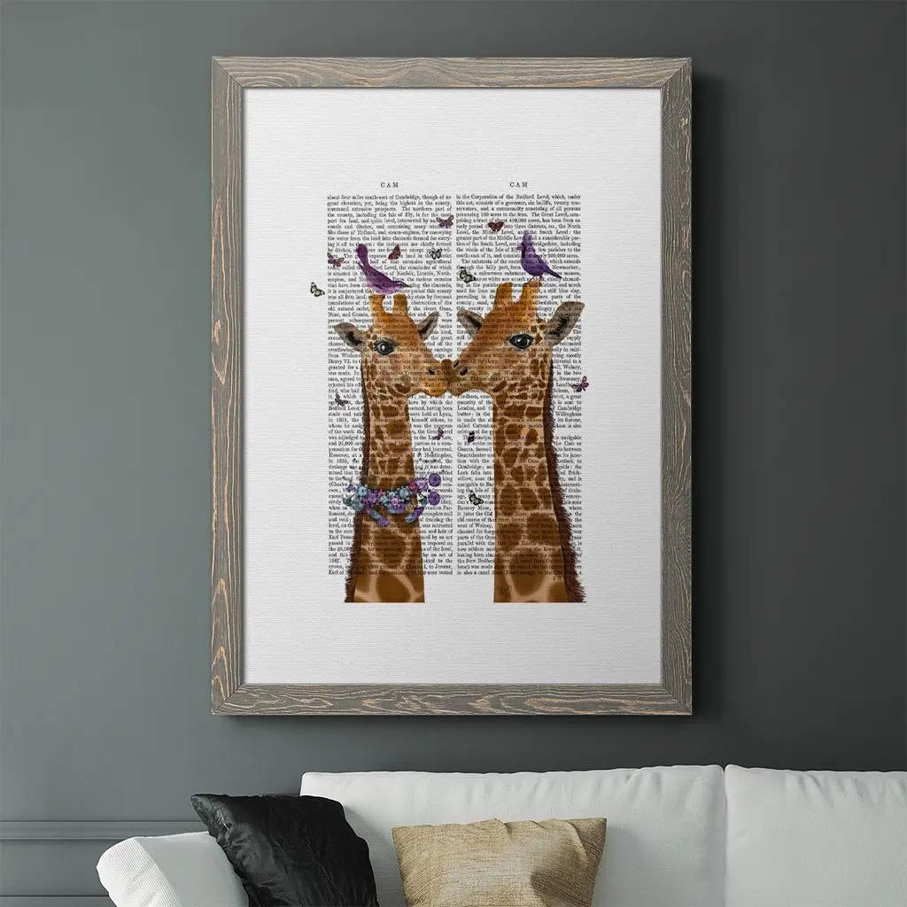 Kissing Giraffes With Birds-Premium Framed Canvas - Ready To Hang - 27.5x37.5 - Grey