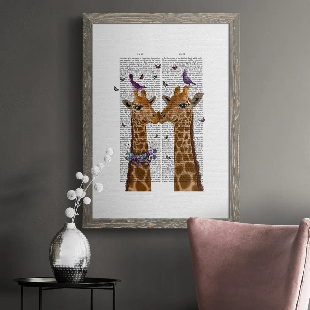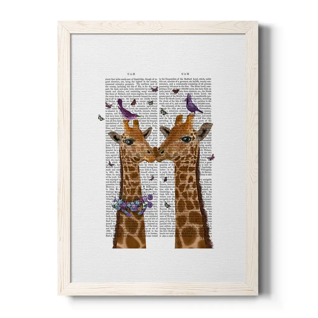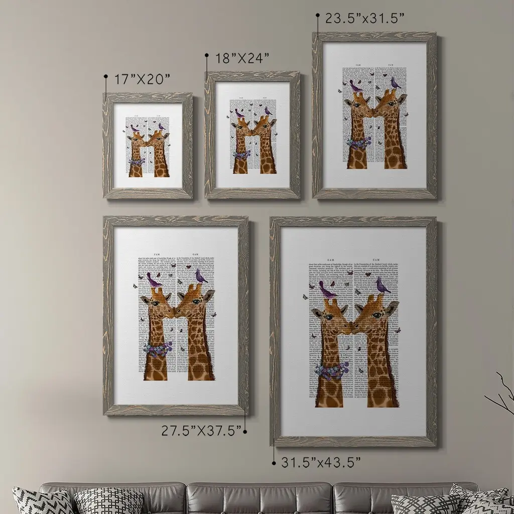 Kissing Giraffes With Birds-Premium Framed Canvas - Ready To Hang - 27.5x37.5 - Walnut