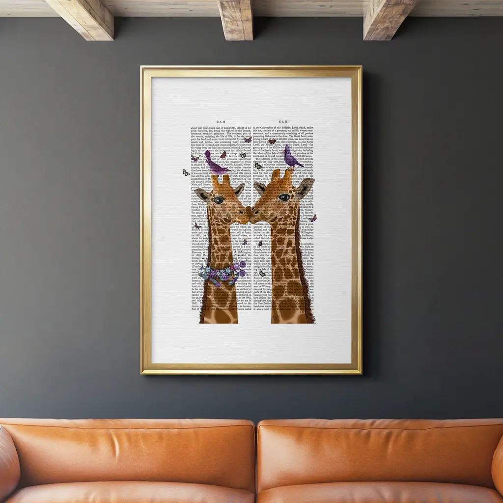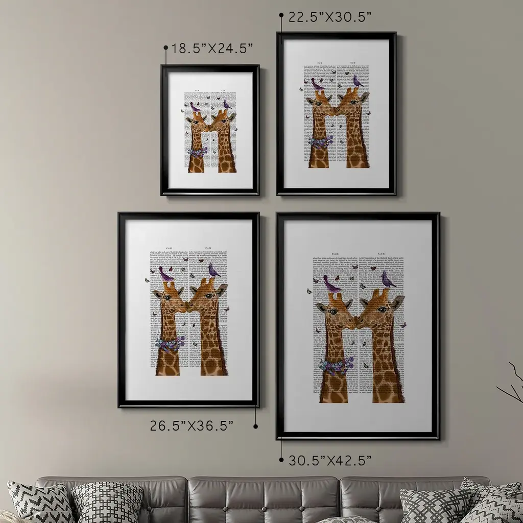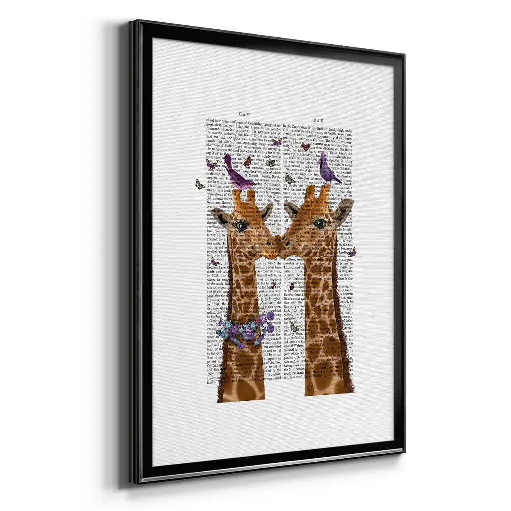 Kissing Giraffes with Birds Premium Framed Print - Ready to Hang A Premium Framed Print created to last. Framed in distressed wood and available in an array of sizes and colors Featuring a beveled a solid wood stretcher bar, each piece comes ready to hand 4 SIZES AVAILABLE 30.5''X42.5'' - Overall Size 26.5'X36.5'' - Overall Size 22.5''x30.5'' - Overall Size 18.5''x24.5'' - Overall Size Each piece is made to order. Each piece comes with hanging hardware. Made in the USA Ready to Hang