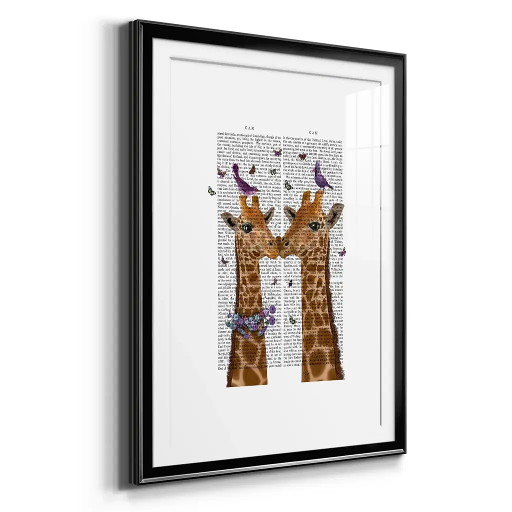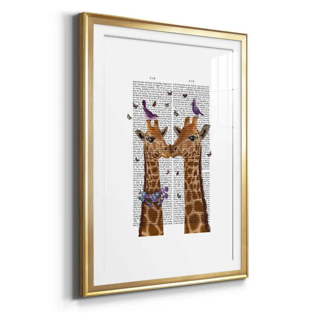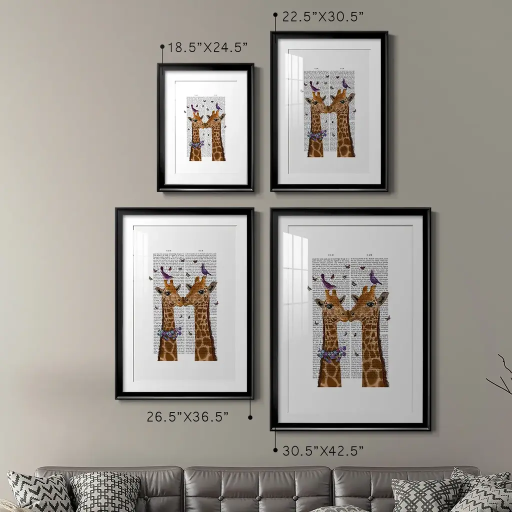 Kissing Giraffes with Birds Premium Framed Print - Ready to Hang A Premium Framed Print created to last. Framed in distressed wood and available in an array of sizes and colors Featuring a beveled a solid wood stretcher bar, each piece comes ready to hand 4 SIZES AVAILABLE 30.5''X42.5'' - Overall Size 26.5'X36.5'' - Overall Size 22.5''x30.5'' - Overall Size 18.5''x24.5'' - Overall Size Each piece is made to order. Each piece comes with hanging hardware. Made in the USA Ready to Hang Giclee Paper Print Acrylic Glass Beveled Matt Board