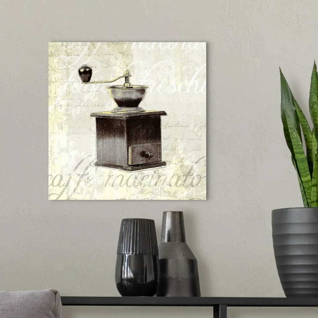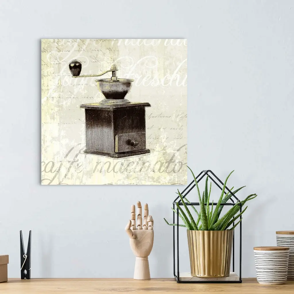 Decorative artwork of a vintage coffee grinder on a beige backdrop that has distressed text in white and gray.