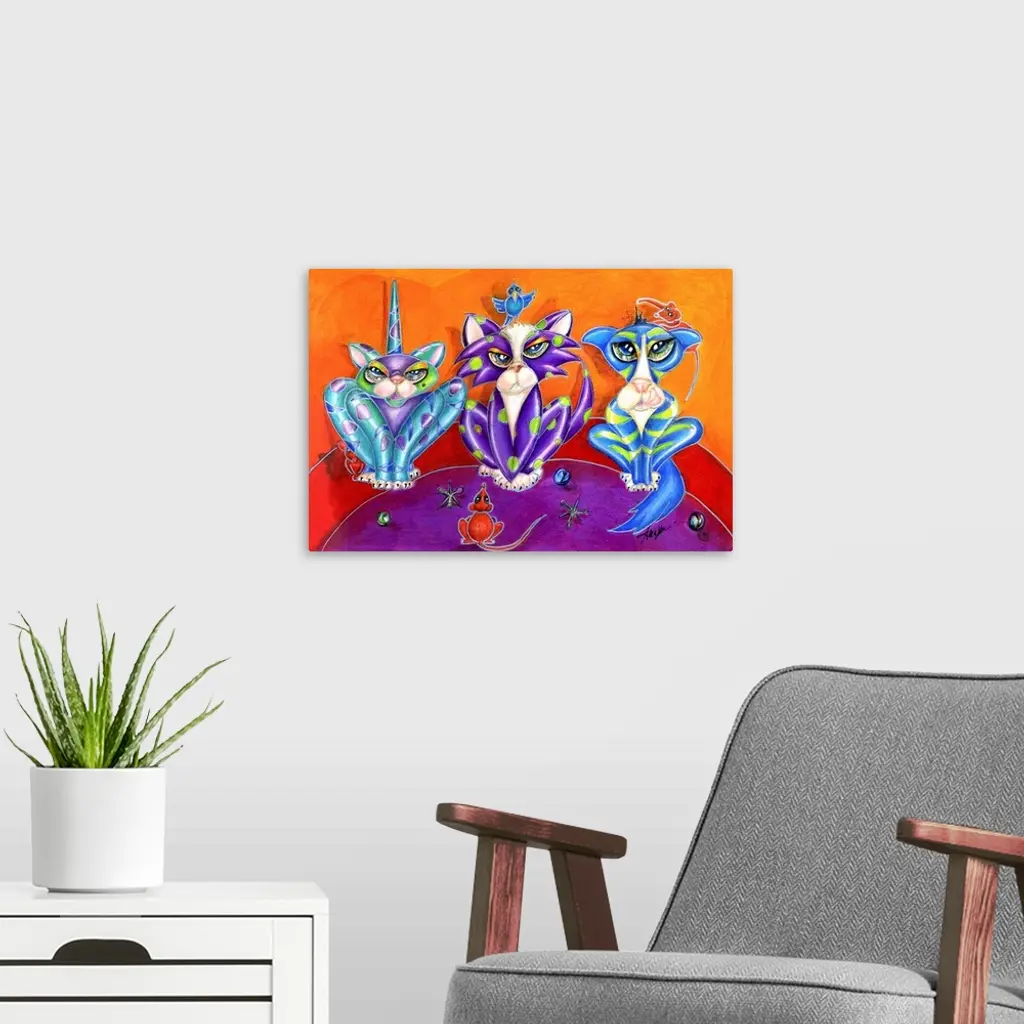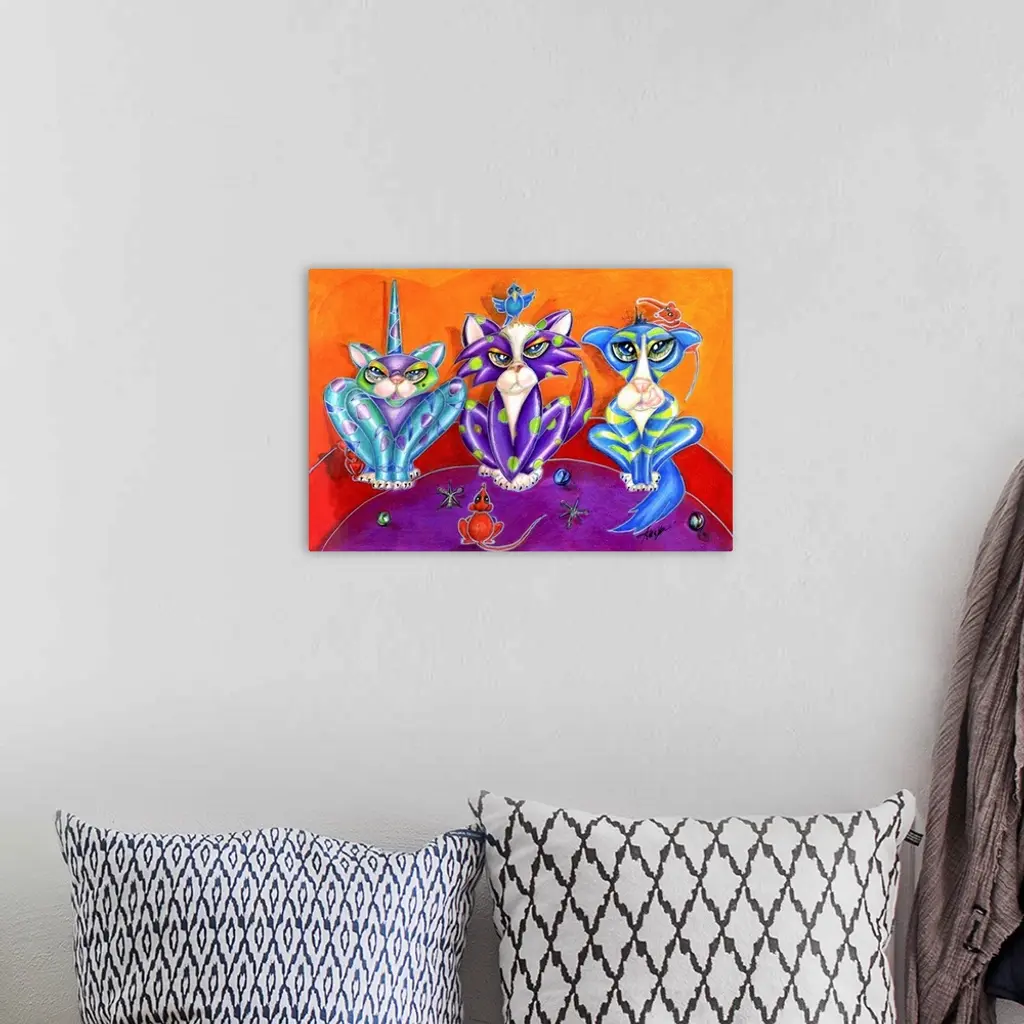 Contemporary artwork in the style of cubism of three cats in bold colors.
