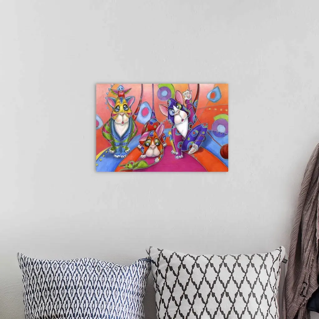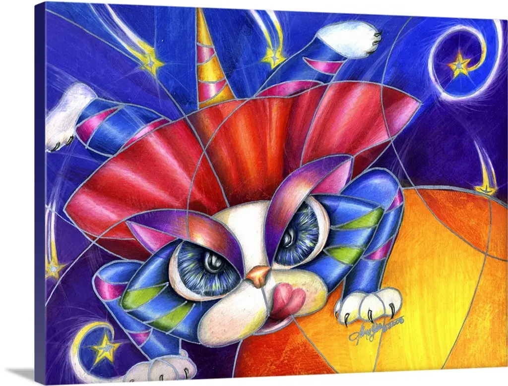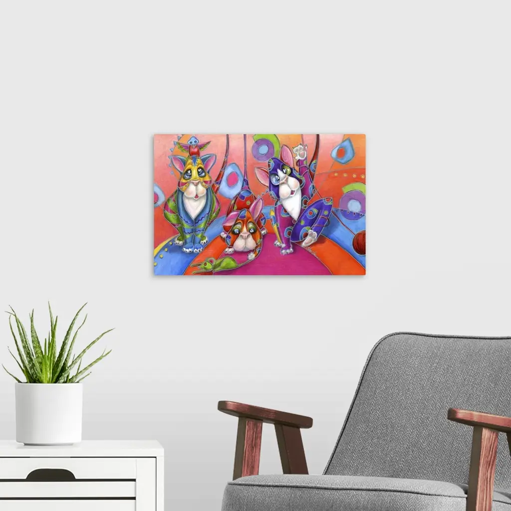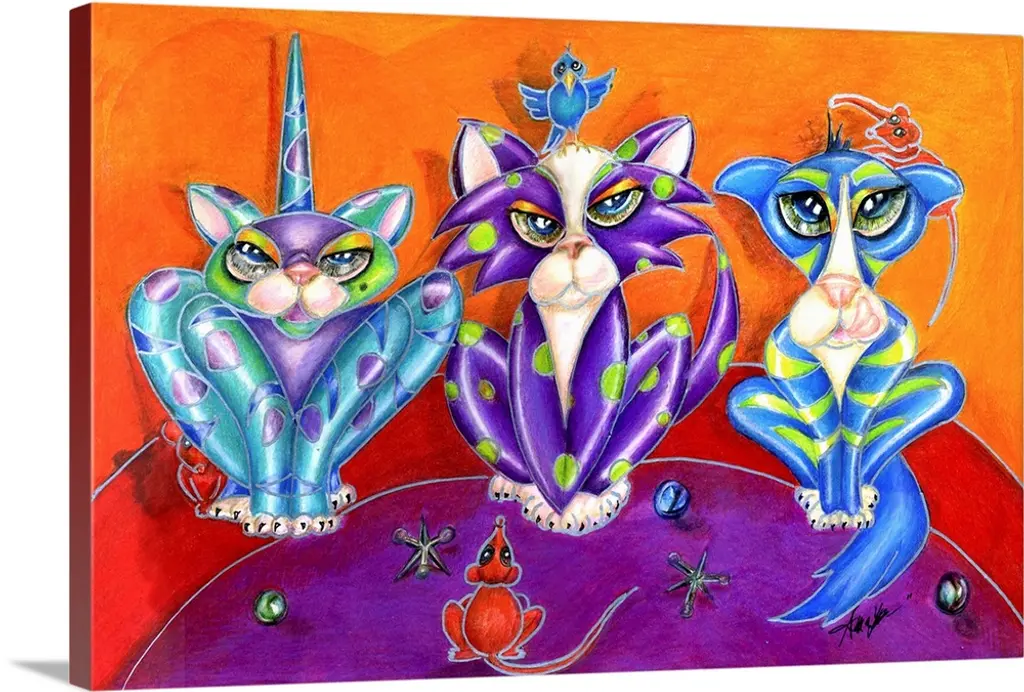 Contemporary artwork in the style of cubism of three cats in bold colors.