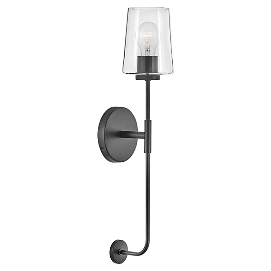 Sleek and slender, with an open retro appeal. The Kline Single Vanity Light from Lark adds minimalist simplicity to a stylish transitional frame. A large disc wall mount retains the fixture via a short crossbar, while a small disc mount below it secures the slender stem that ascends vertically, seating a single-socket lamp inside a clear glass shade beveled slightly inward. The fixture’s architectural simplicity plays well with its fluid elegance, and the thick-walled shade gentles glare to the sides while casting a focused wash of uplight through its open top.