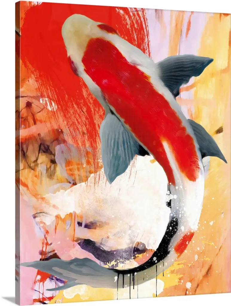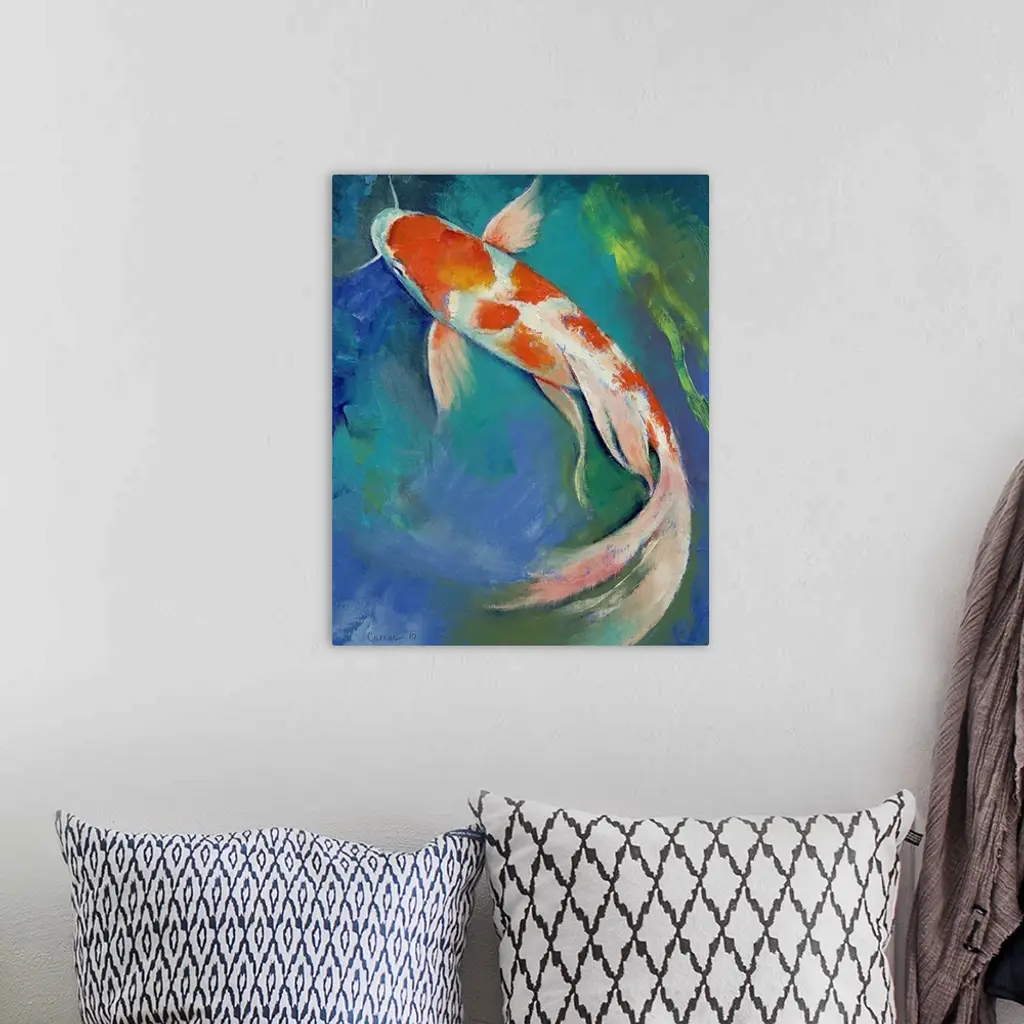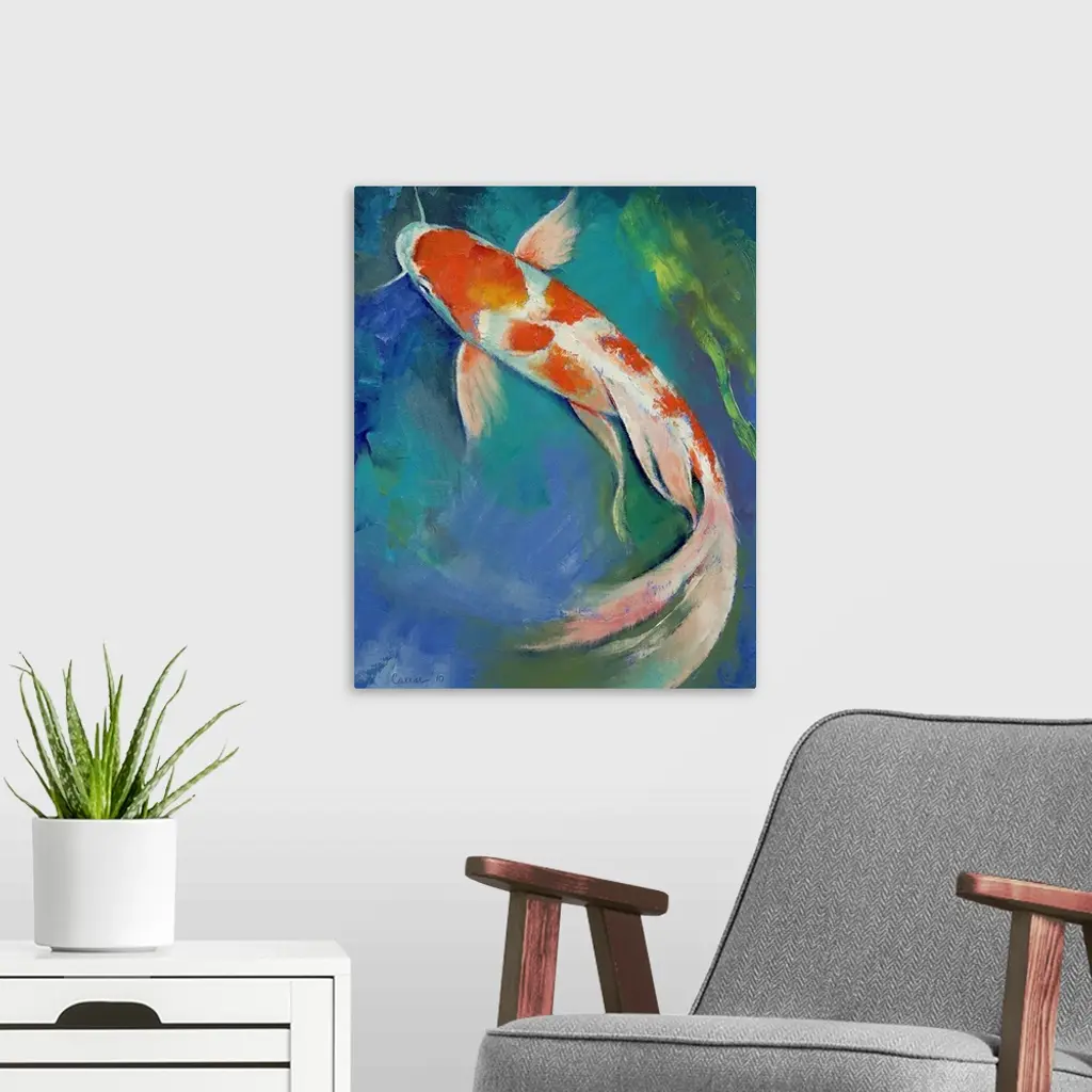 Original oil on canvas painting by American artist Michael Creese of a large koi fish with a flowing tail.