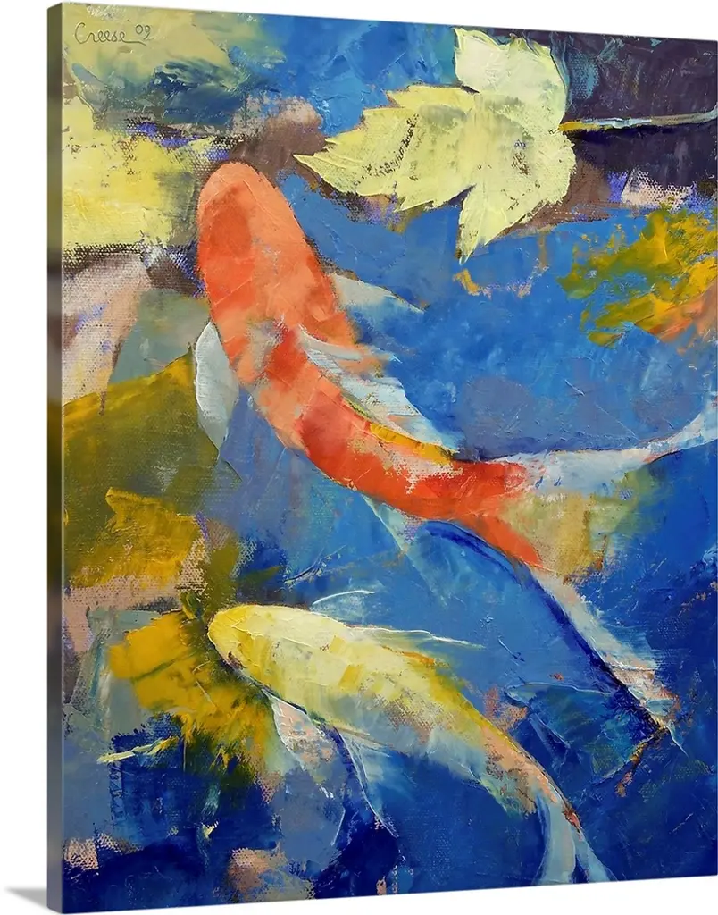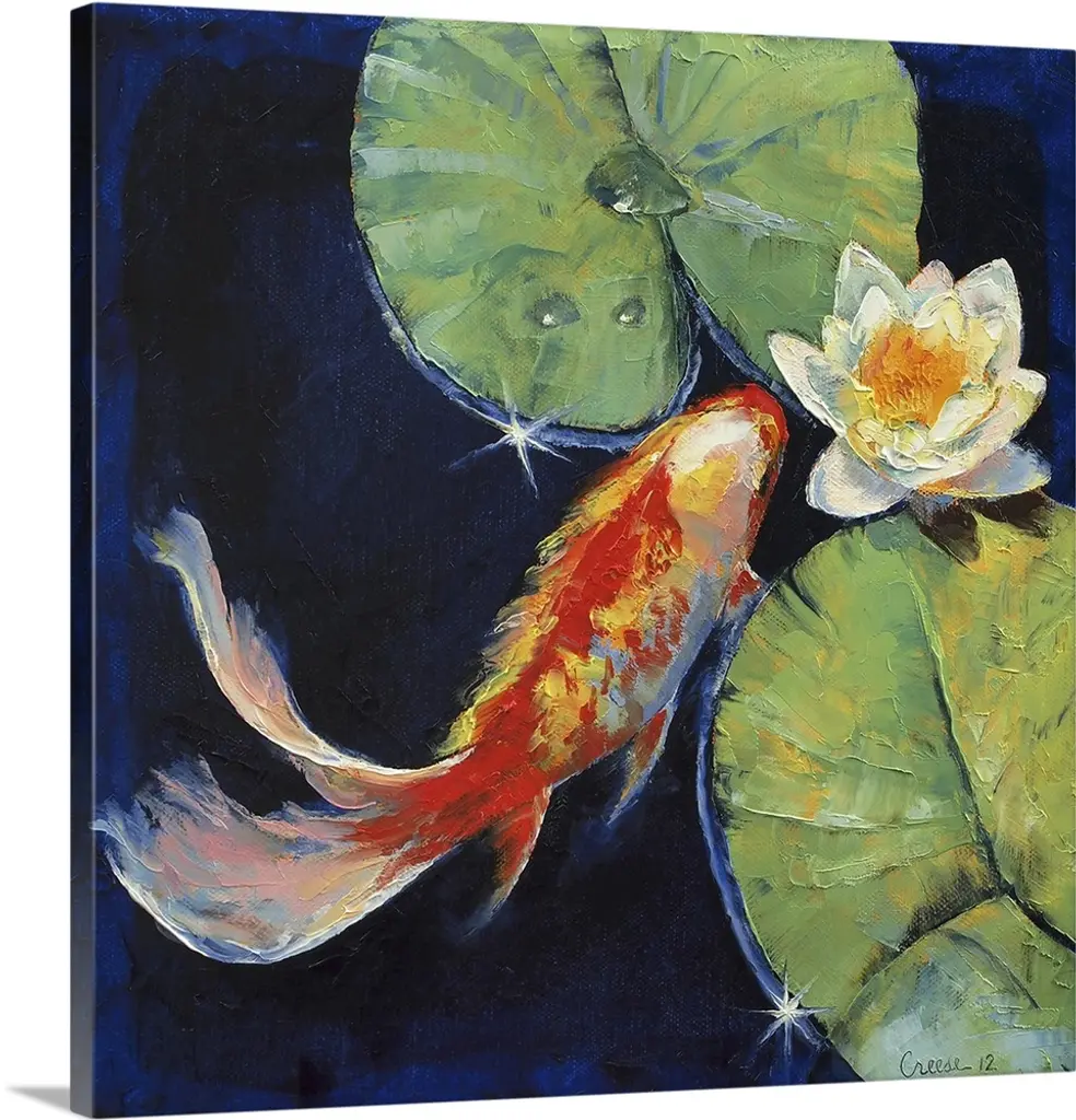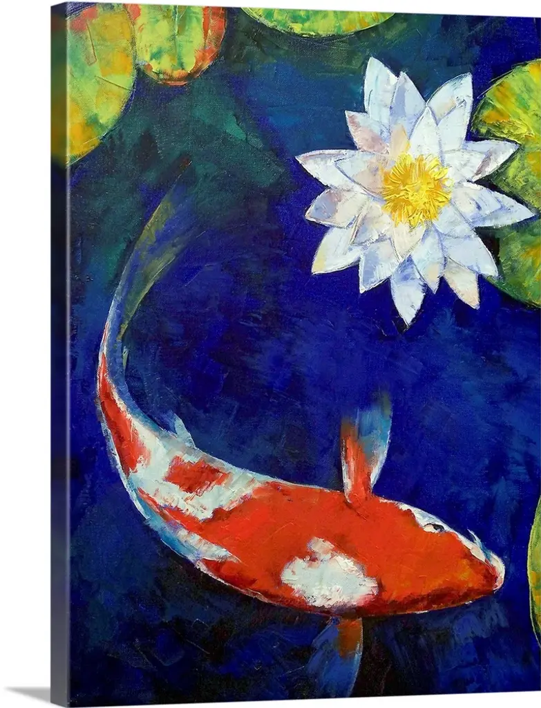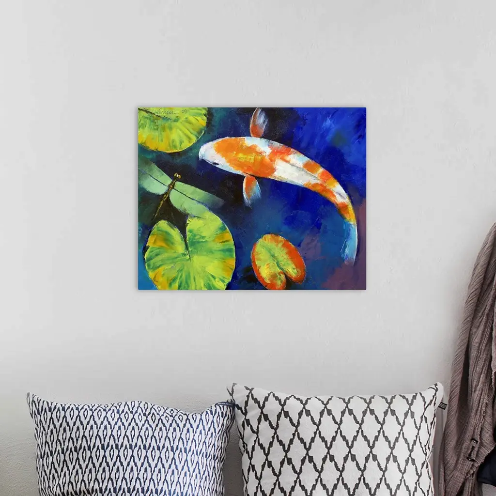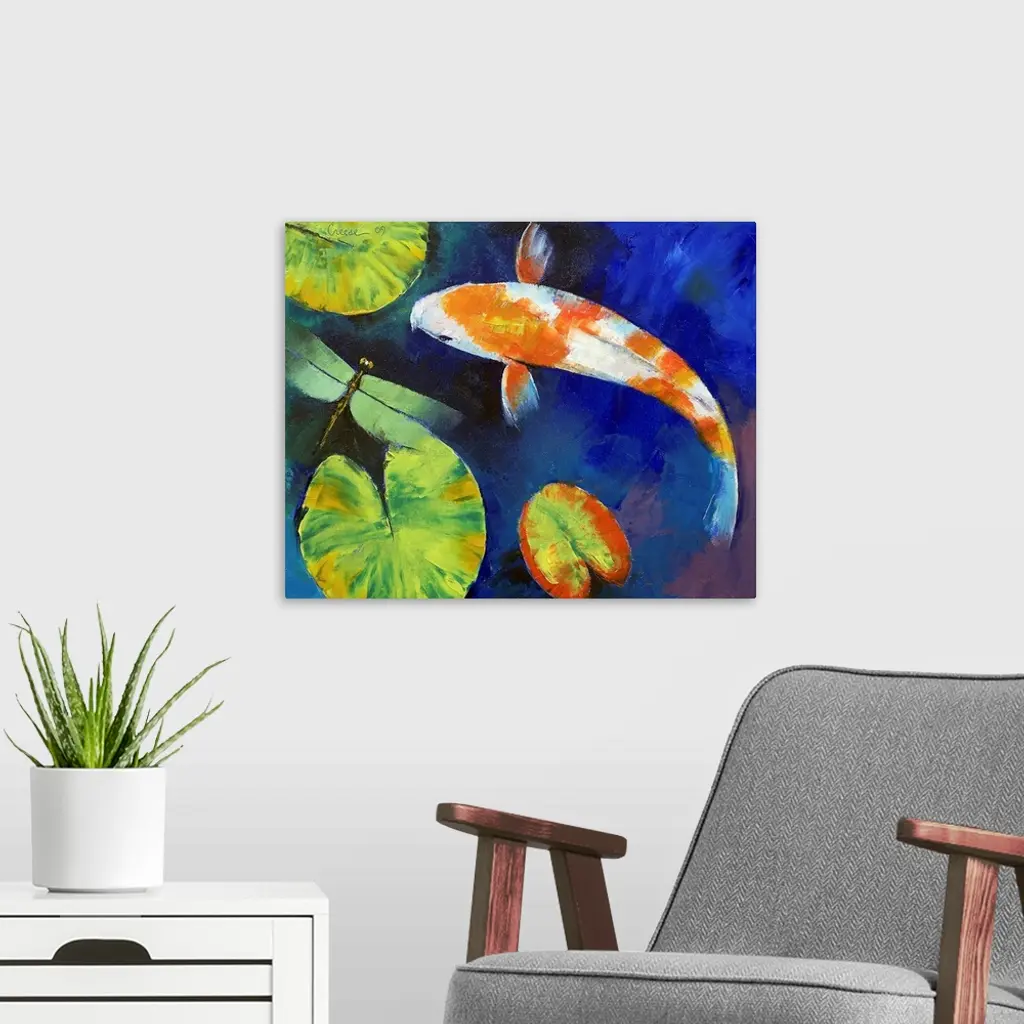 Big, horizontal painting of a Kohaku koi fish swimming around several lily pads in deep blue waters, while a dragonfly flies overhead.