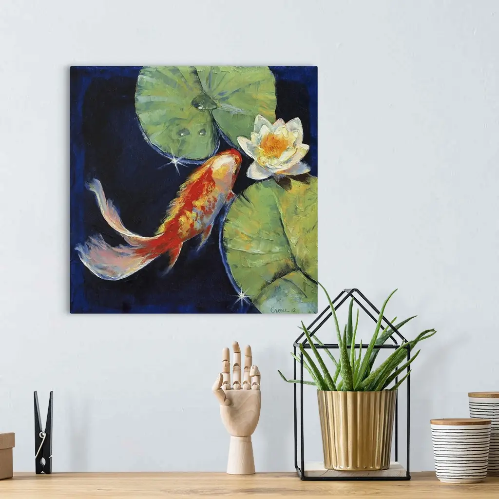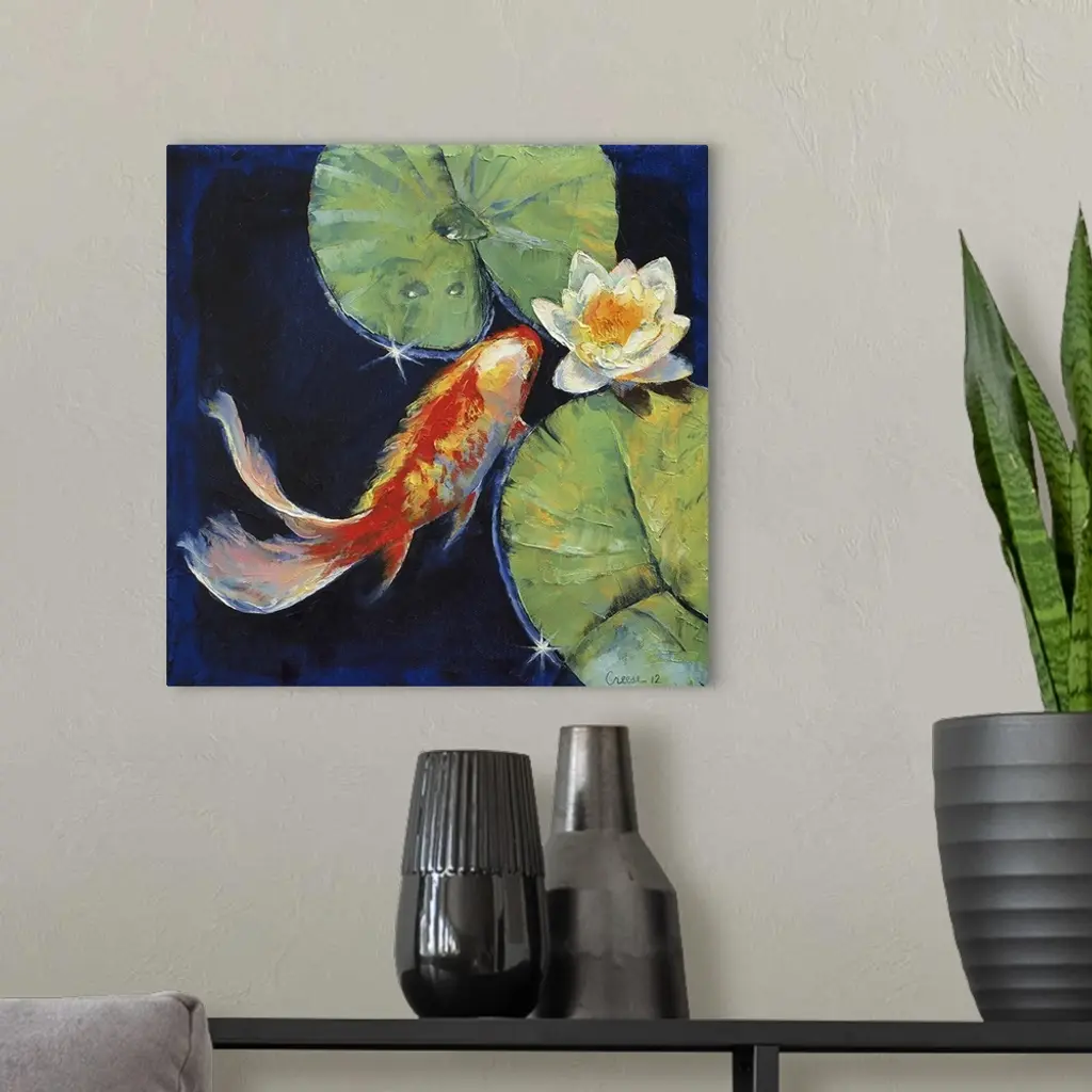 Contemporary artwork of a red koi fish swimming near the surface of the water with lily pads and a lotus flower.