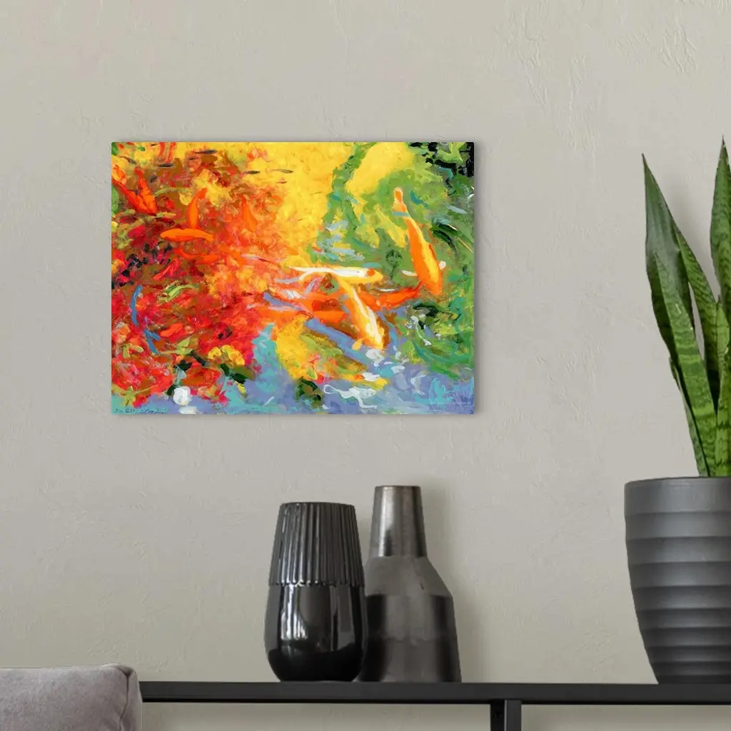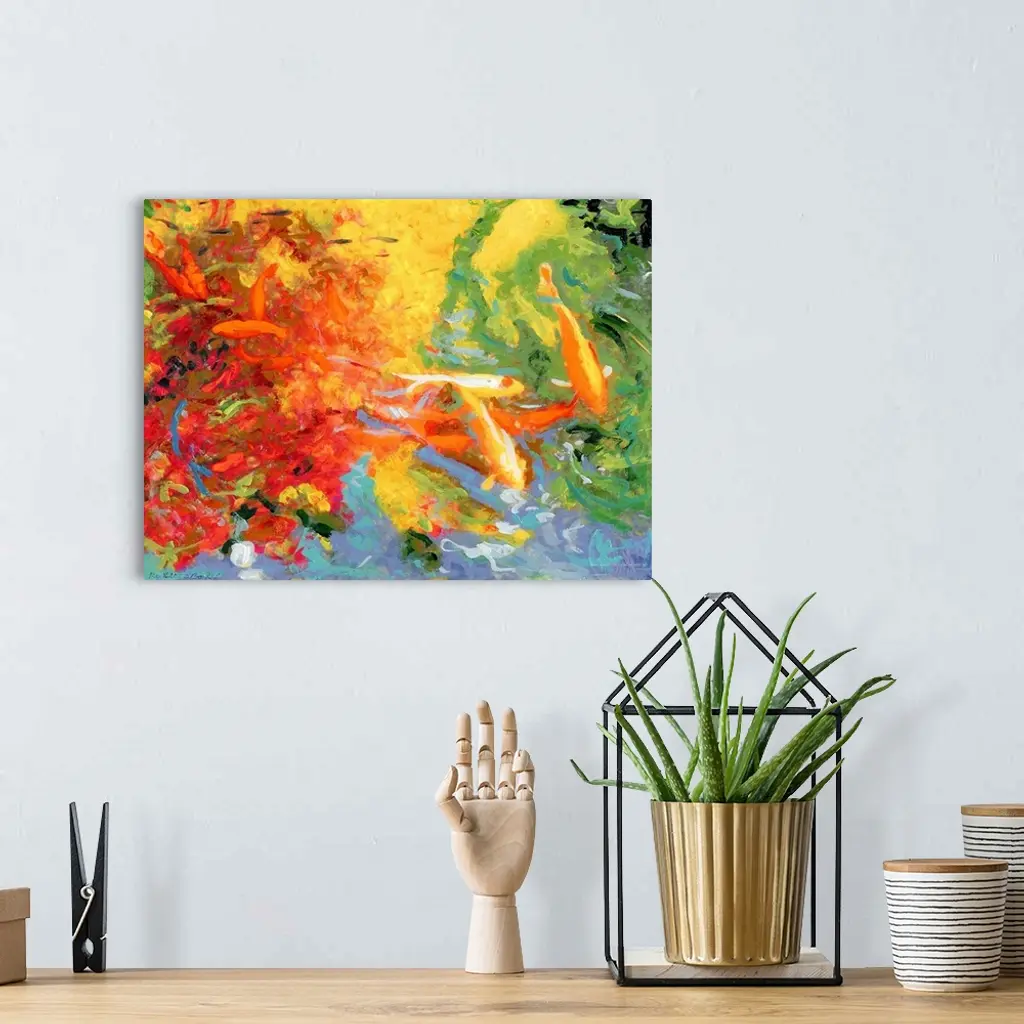 Koi Pond Beverly Hills, California by RD Riccoboni 2007 an abstract post impressionist style painting.The word koi comes from Japanese. The original Japanese word koi simply means carp, including both the dull grey fish and the brightly colored varieties. A homonym of koi means 'love, affection' and koi are therefore symbols of love and friendship in Japan: a good example is the short story Koi-san by Mukoda Kuniko.Koi are believed to have originated from Eastern Asia, Aral, Black and Caspian Seas. Earliest records of Koi have been found in China and have been widely spread in Japan. The ornamental cultivation of carp flourished under the Chinese Qing Dynasty and Japanese Yayoi Period. They are very closely related to goldfish and, in fact, the style of breeding and ornamentation has become very similar, probably through the efforts of Japanese breeders to emulate goldfish. Koi and tattoos of koi are traditionally considered lucky.