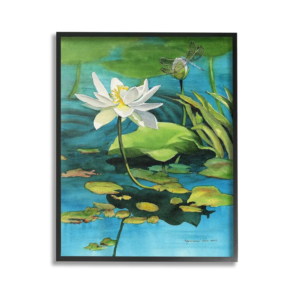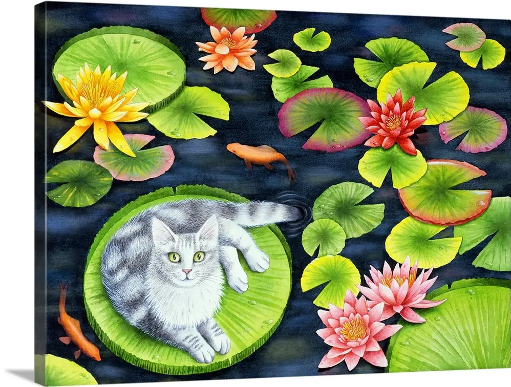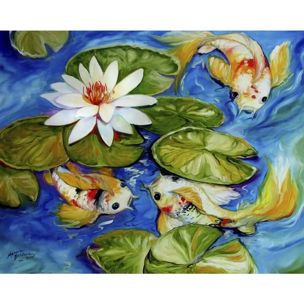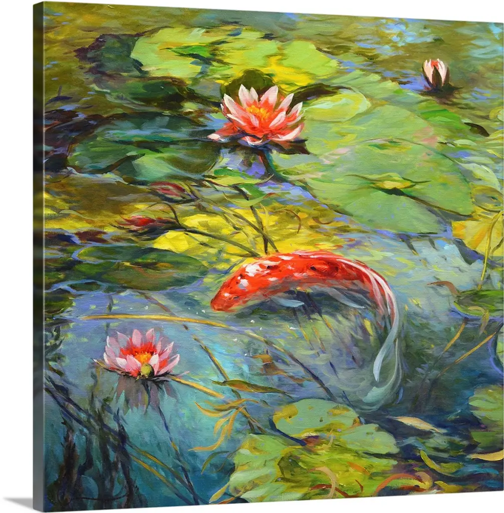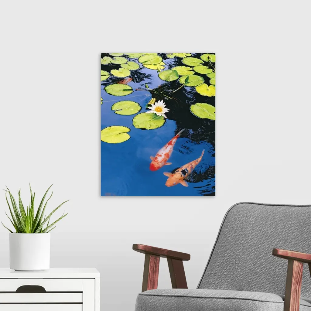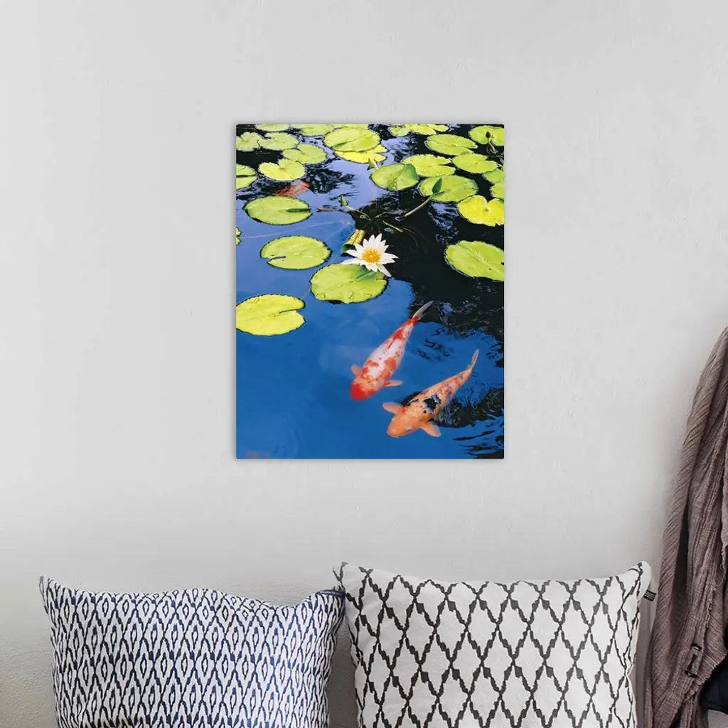 Decorative artwork for the home or office that shows two koi fish swimming just under the surface of the pond with lily pads scattered across the top of the water.