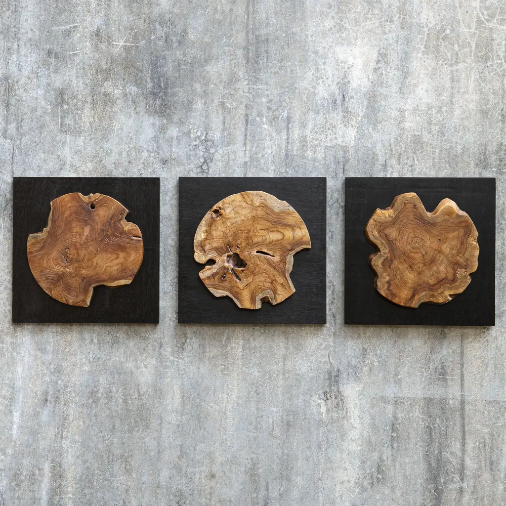 This Striking Set Includes Three Satin Black Wood Panels Featuring Deeply Grained Cross Sections Of Natural Teak Wood. Sizes And Grain Pattern May Vary Due To The Authentic Nature.