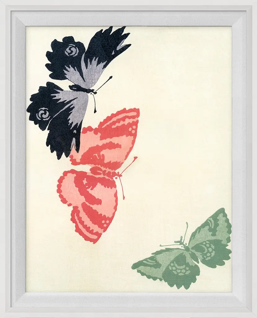 Mounted on deep panels, the detail and design of these antique, Japanese butterfly prints are mesmerizing en masse or apart.