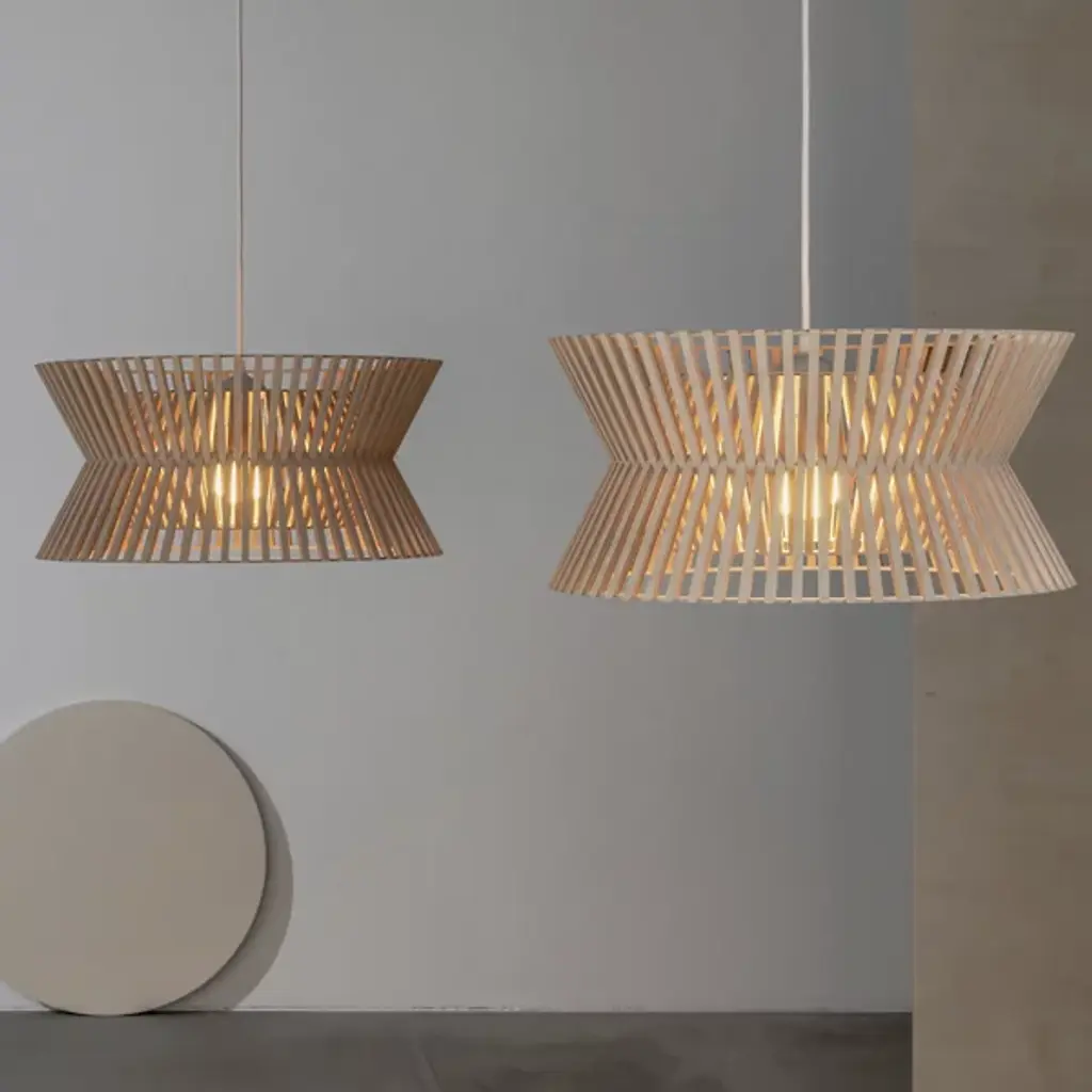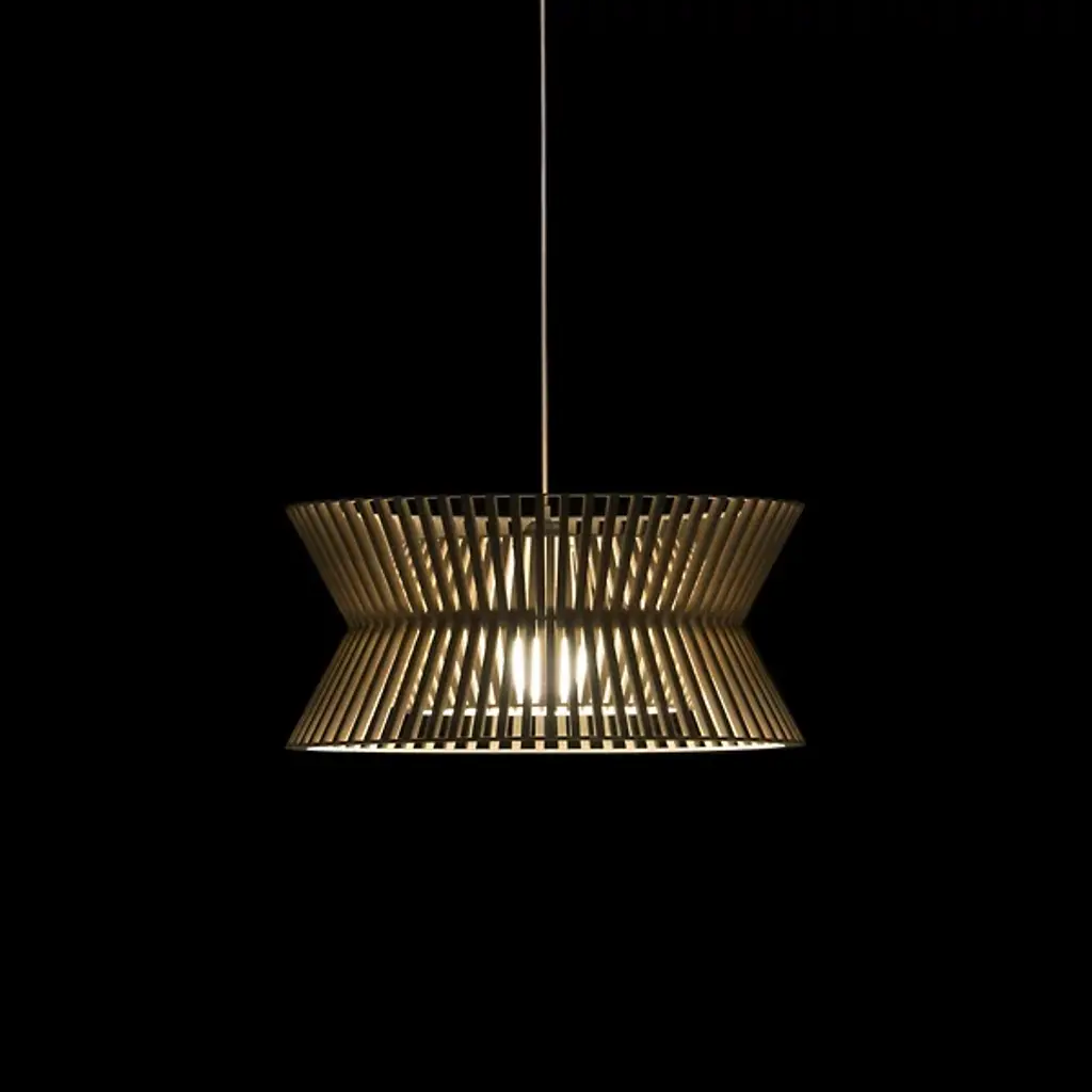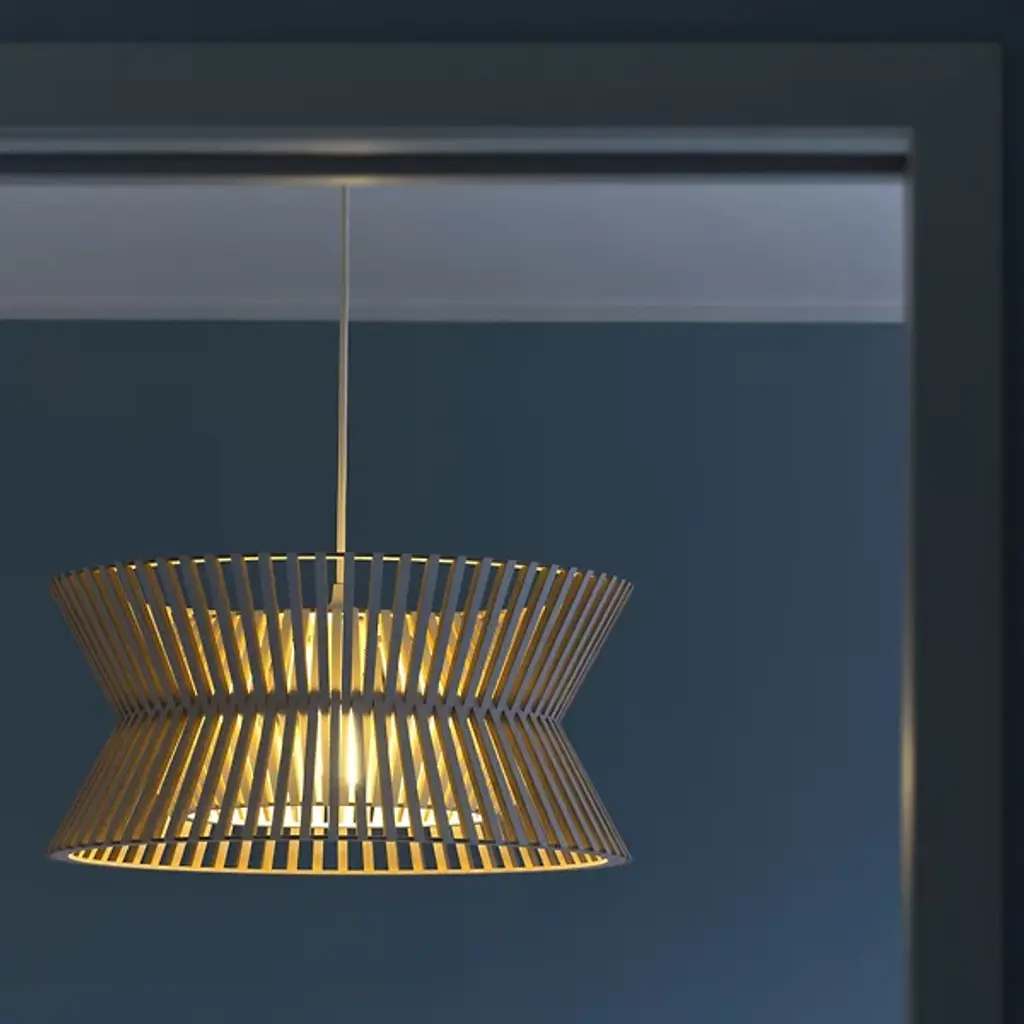 Elegant, open, intricate. Lose yourself in the hypnotizing play of light and shadow created by the Kontro 6000 Pendant from Secto Design. The spirit of designer Seppo Koho’s sketches and handcrafted wooden prototypes stay intact with this beautiful finished product. Koho’s Finnish roots show in the design’s clean Scandinavian aesthetic and birch wood construction. Trim birch wood slats move in an elegant interlacing design composed by Finnish craftsmen. The spaces in between each slat create an intricate layered design that draws your eye from across the room. A flip of the switch enhances the complex form with a dramatic silhouette. Light filtering out creates a comfortable aura you want to be inside.